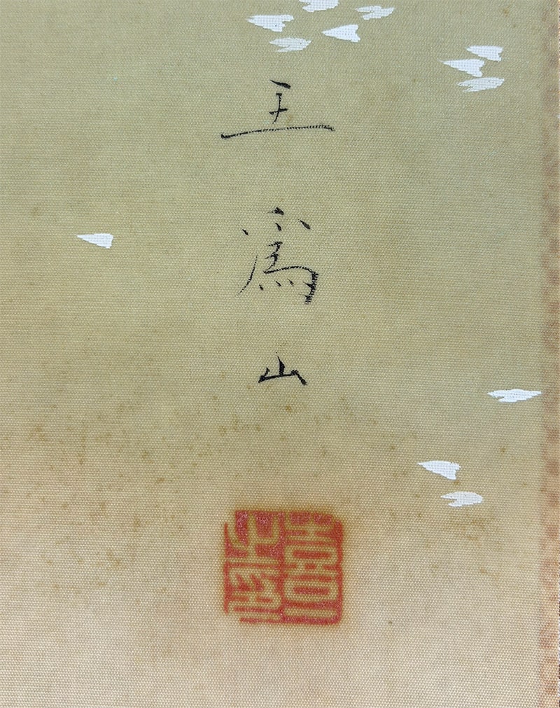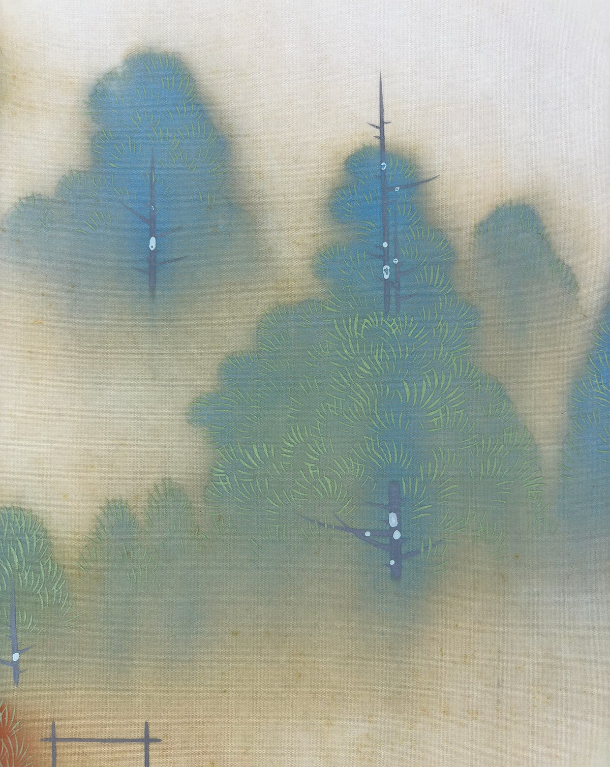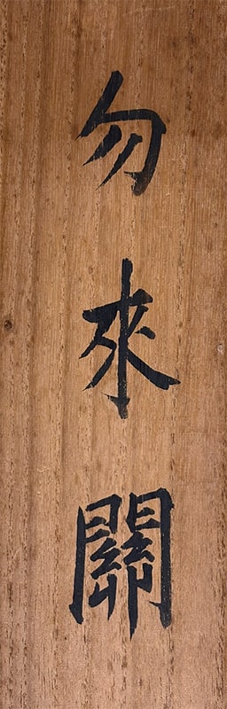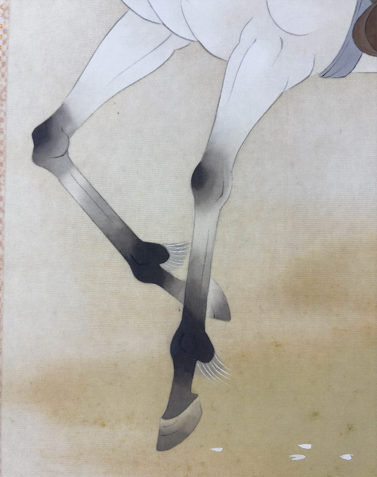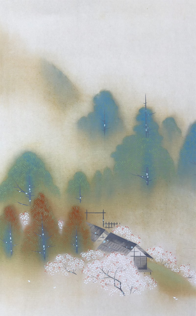 ●この作品では武人が満開の山桜の中に緻密な筆で美しく描かれています。鞍上の武人は天下一の武勇の士と賞讃された源義家で、勿来(なこそ)の関の場面と思われます。勿来の関は白河関、念珠関と並んで奥羽三古関の一つとして名高い関所です。これを「勿来」(来るなかれ)と呼んだのは平安中期ごろからで、北方の蝦夷の南下をせきとめるためであったと言われています。紀貫之、小野小町、和泉式部、西行法師など多くの歌人が風光明媚なこの関を歌に詠んで有名ですが、なかでも義家の歌は千載集に掲載されて広く知られています。