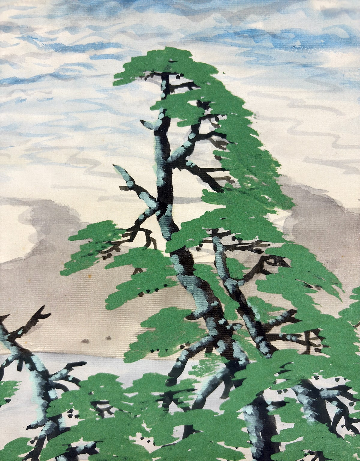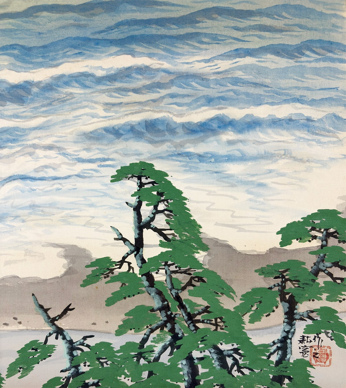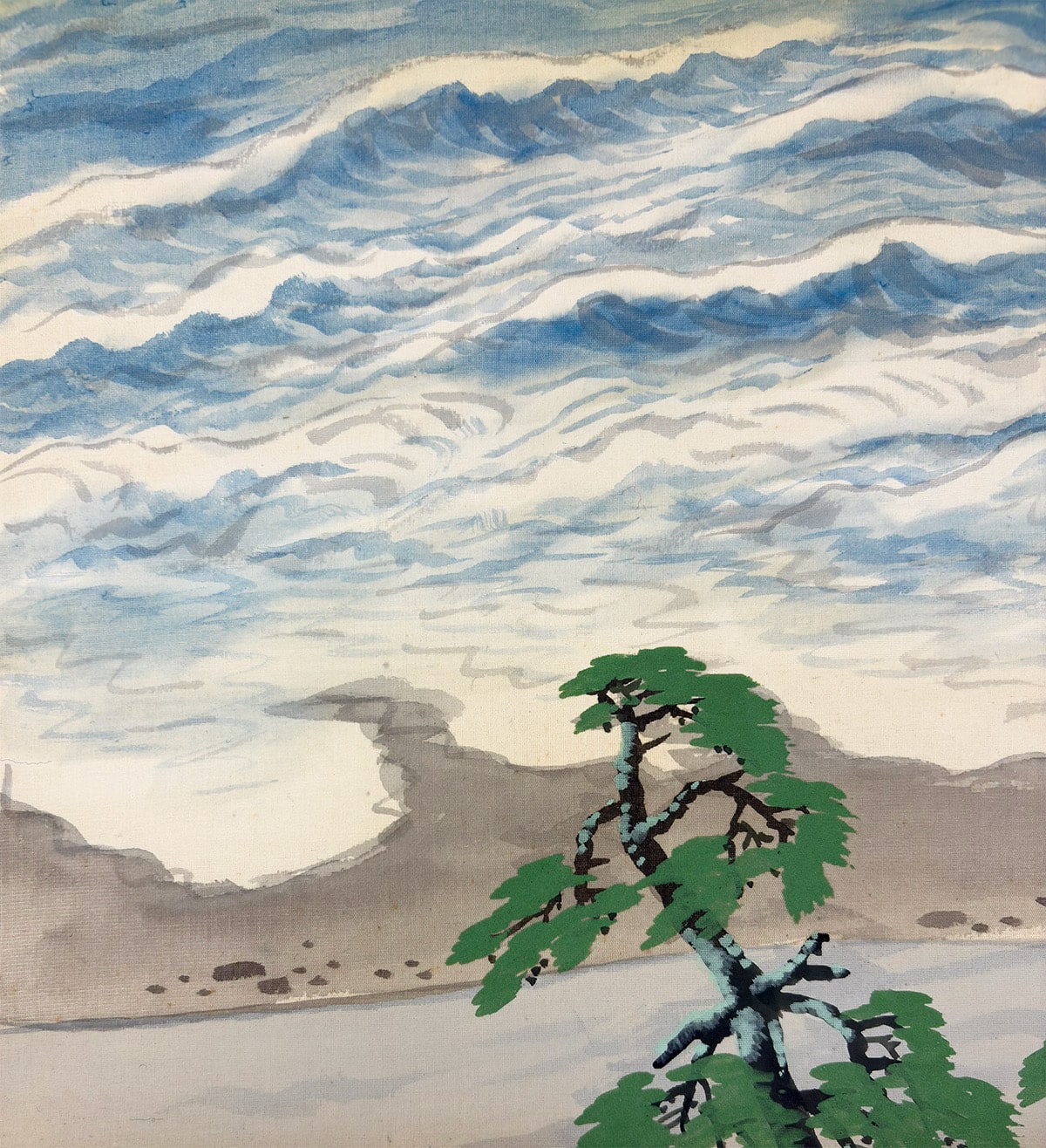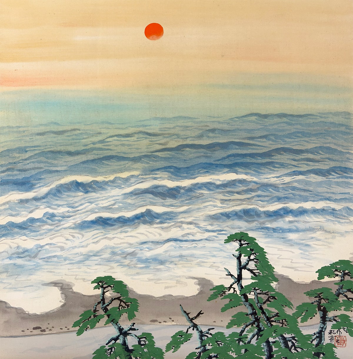 ●黄色から青へと移ろう春空のグラデーション、のたりと寄せる波の柔らかなリズム、そして手前に配された松の緑が調和し、季節の始まりにふさわしい清々しさを描き出しています。