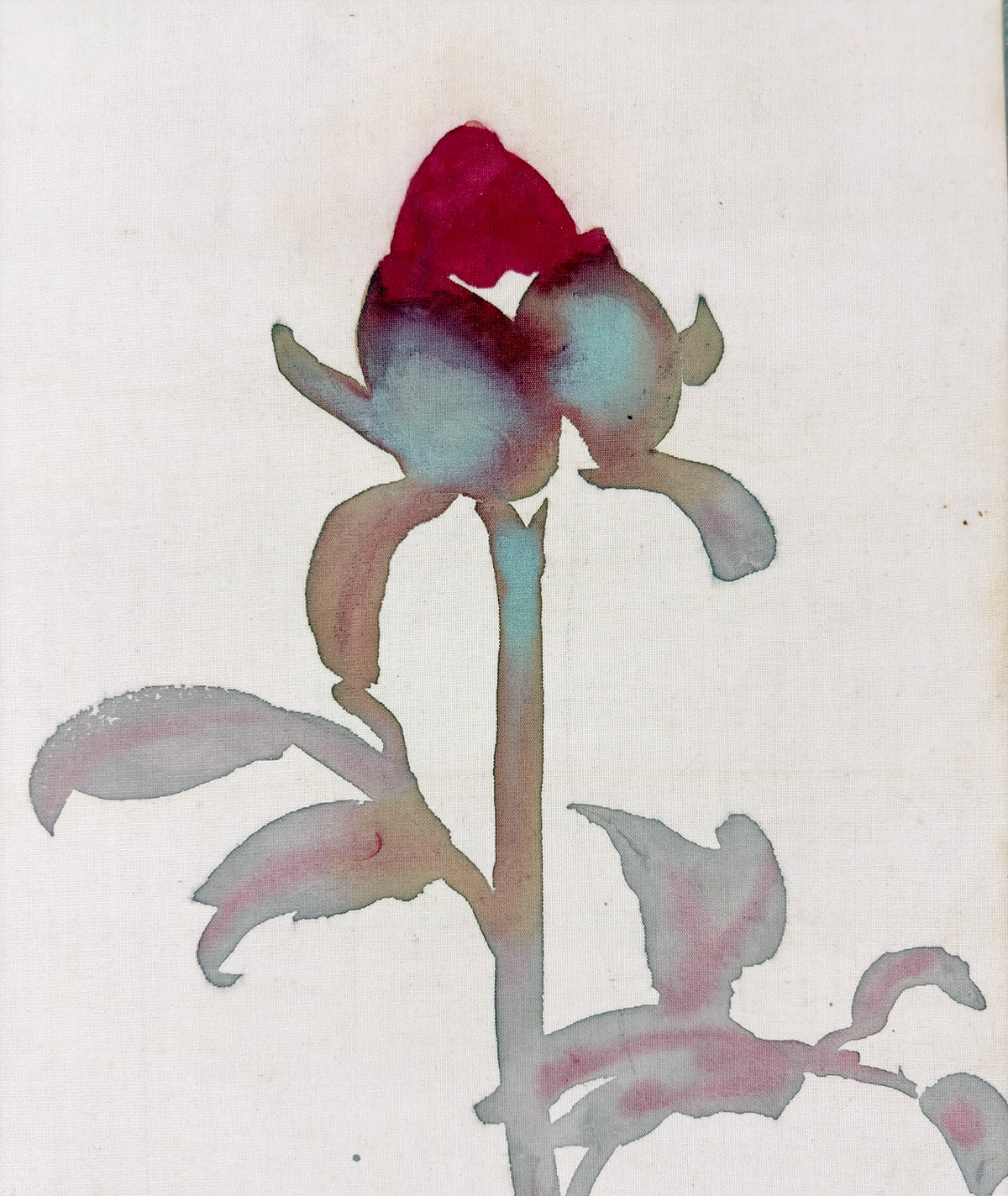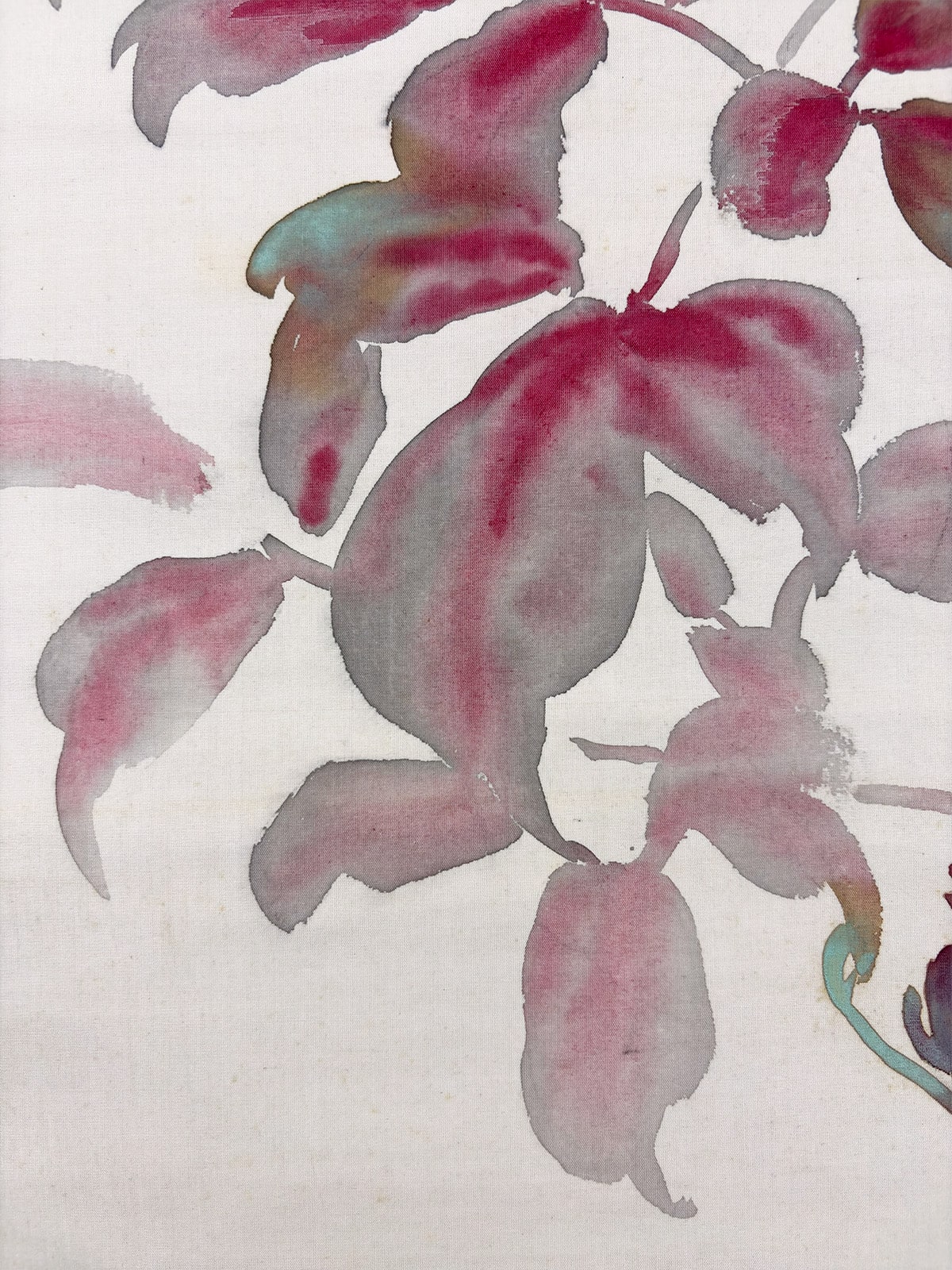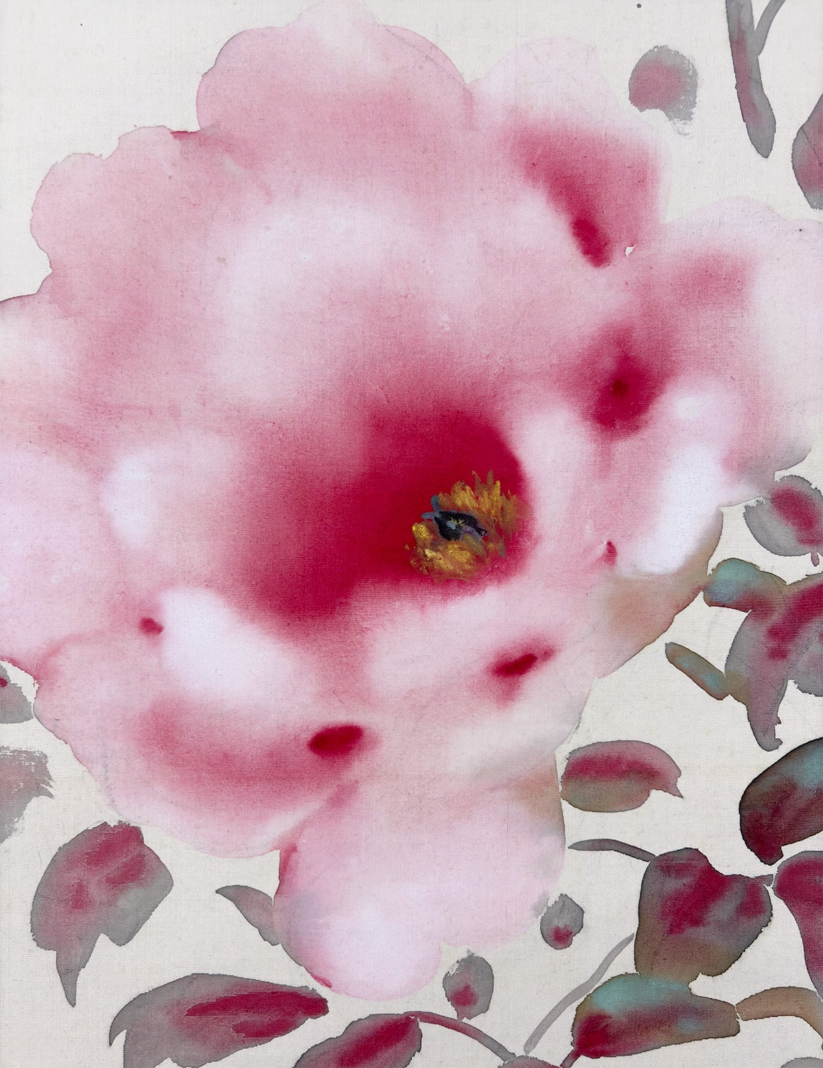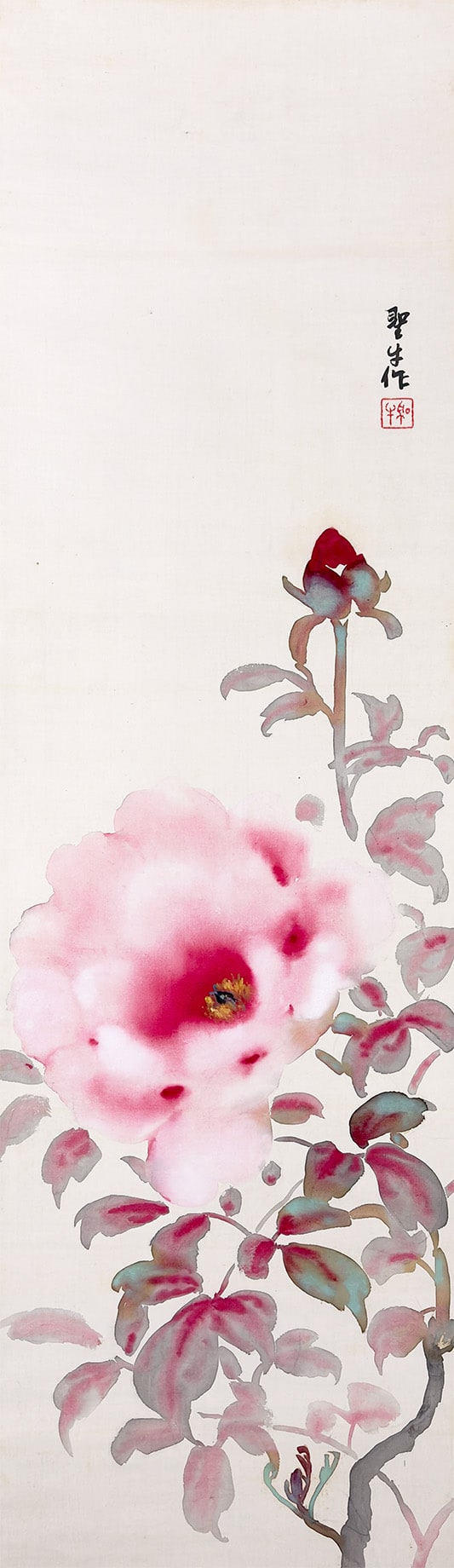 ふっくらと咲き誇る牡丹を、清らかな色調と落ち着いた筆づかいで描いた一幅です。