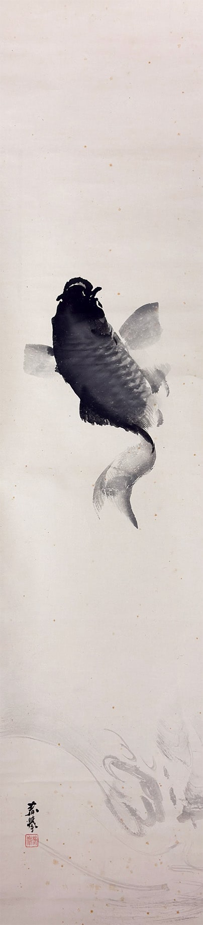 ●本作《躍鯉》は、鯉が水を力強く上へと進む姿を描いた吉祥画で、