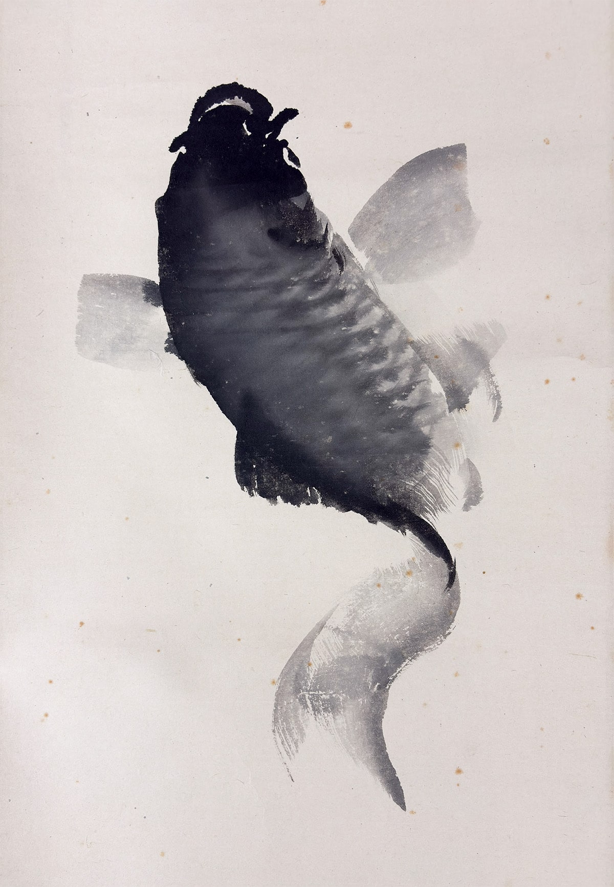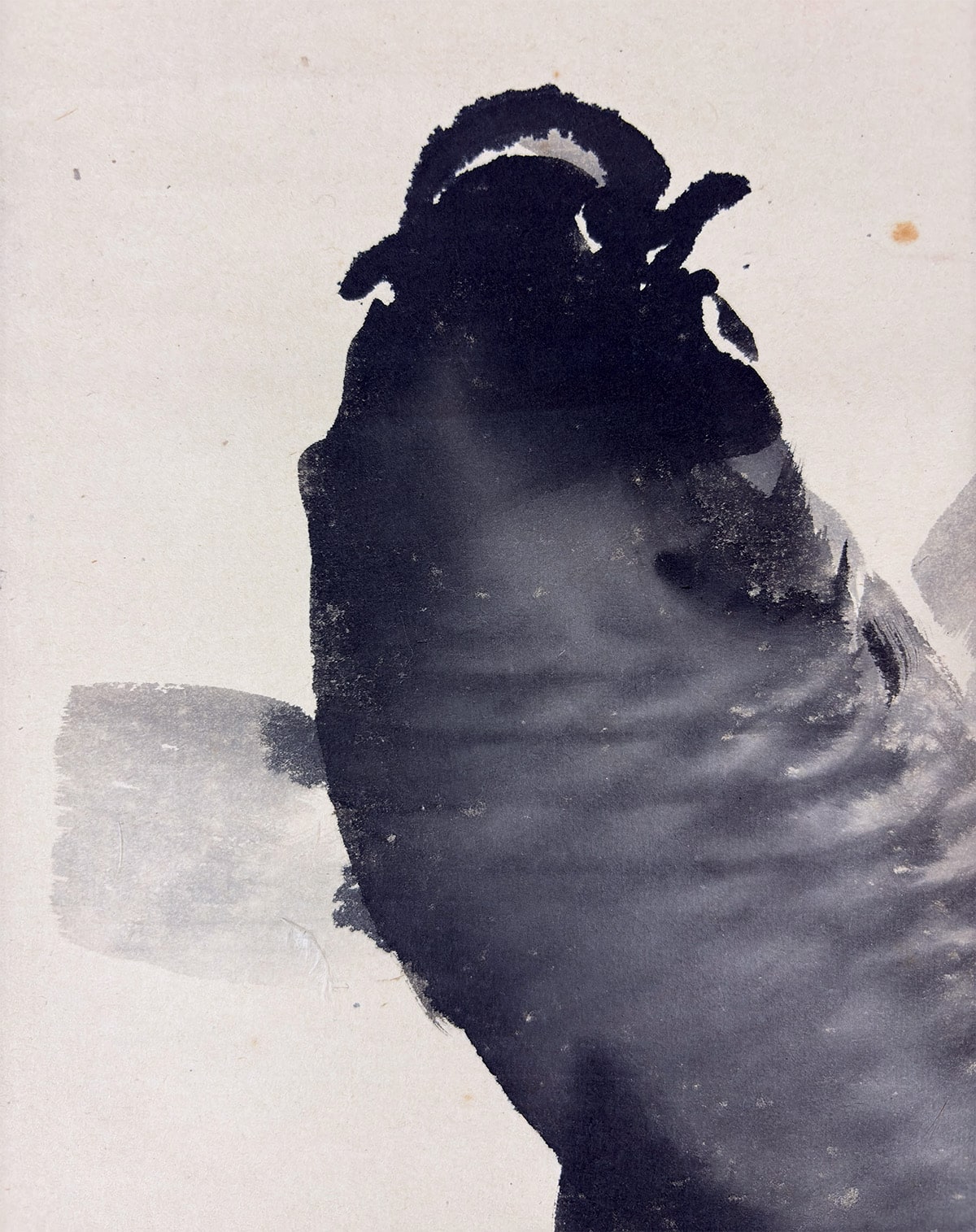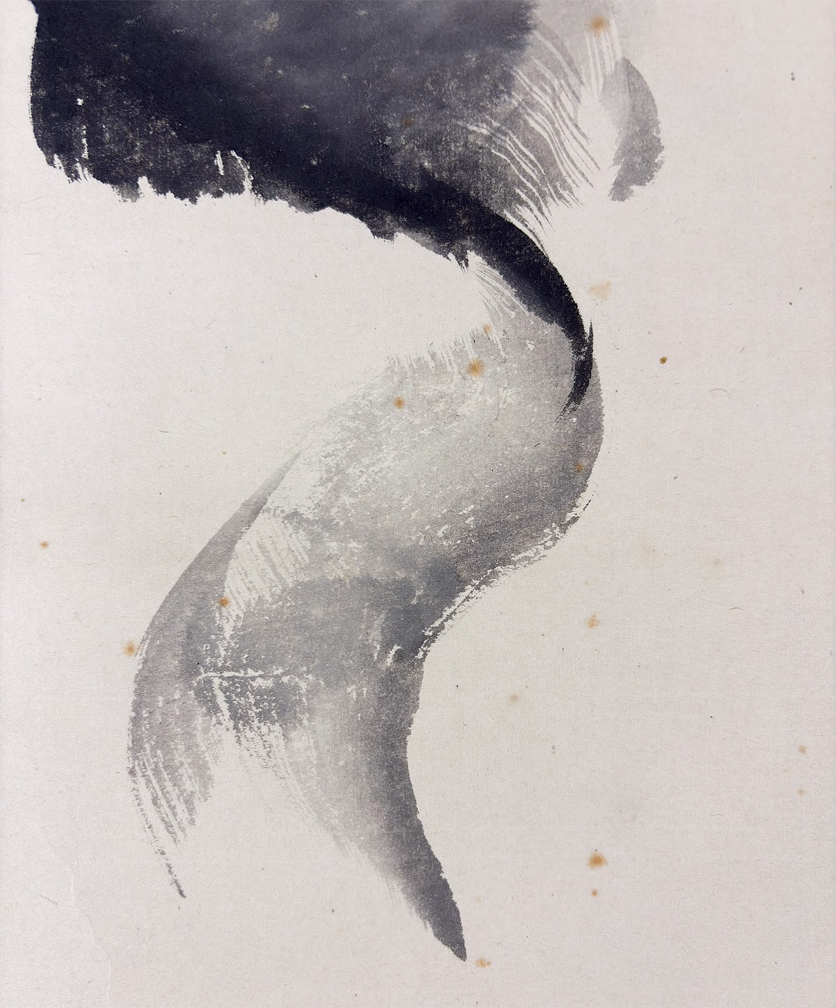 ●墨の濃淡を巧みに使い分け、体幹には深い墨を置き、ひれ先に向かうほど淡墨へと移ろうことで、水を切って進む重量感と、上昇する動きの軽やかさが見事に表現されています。