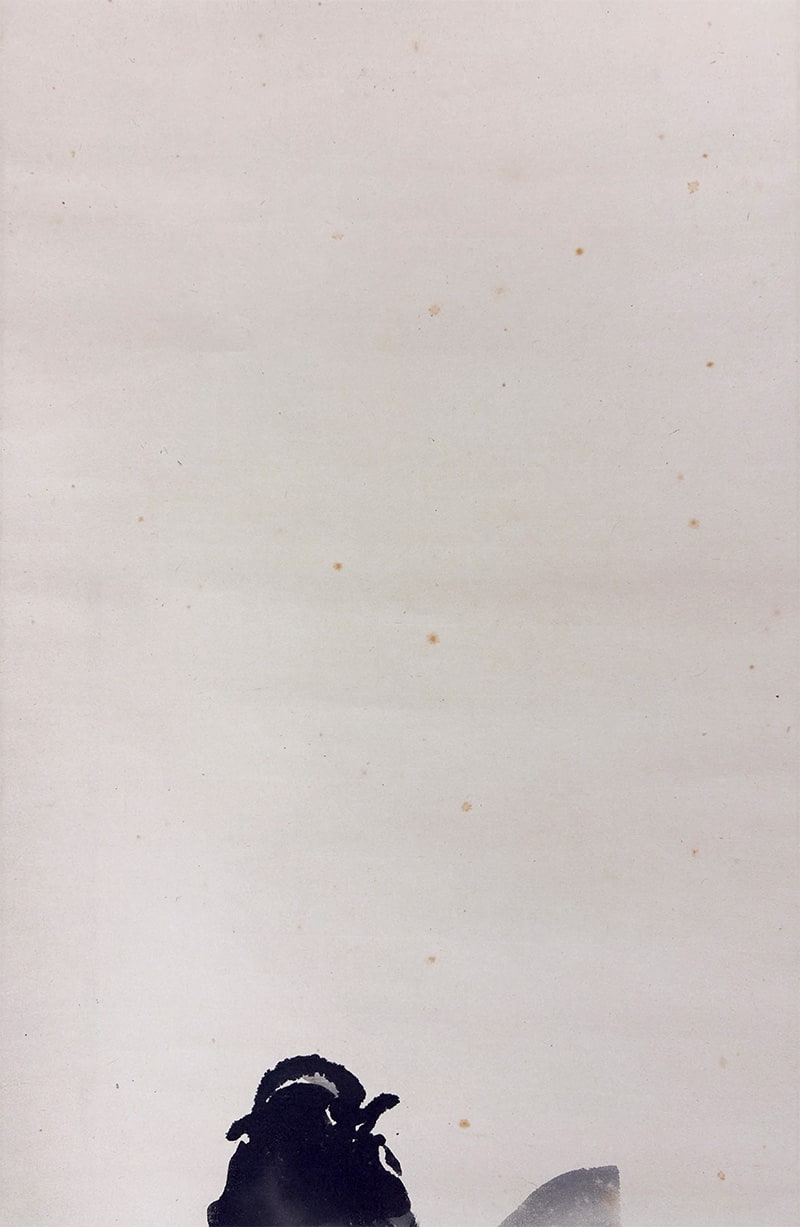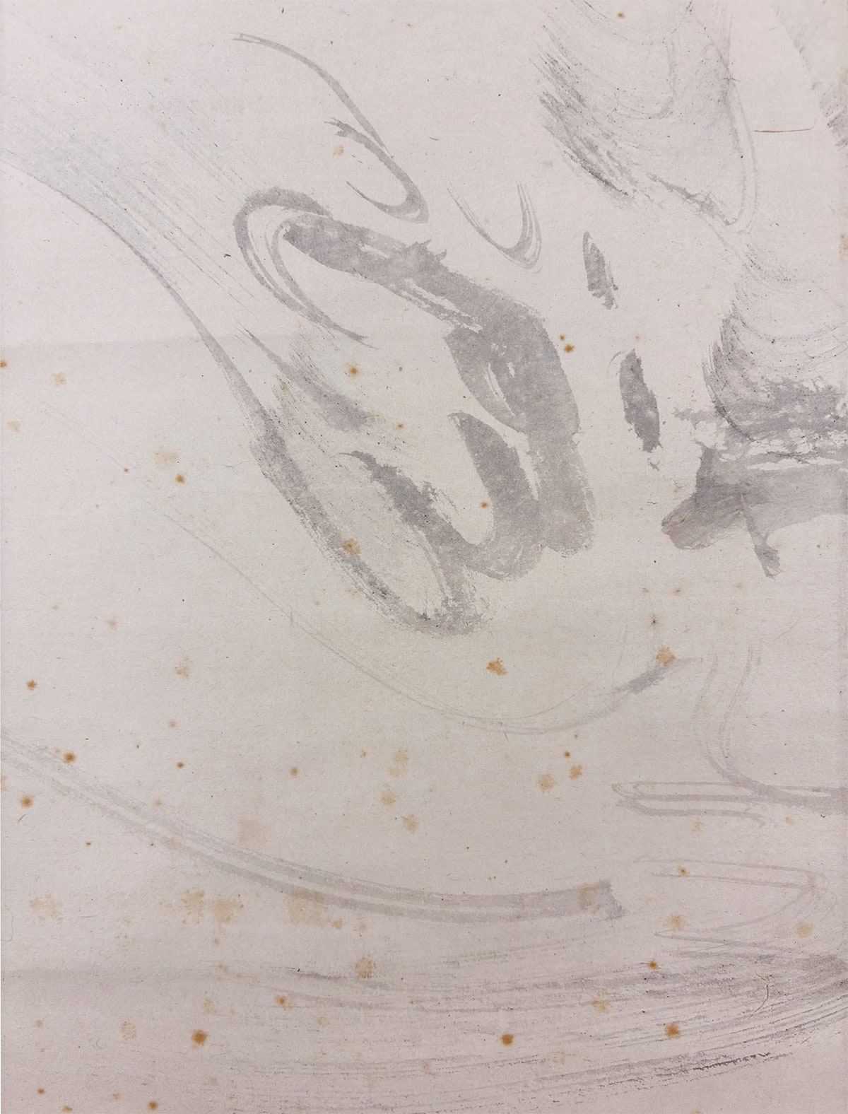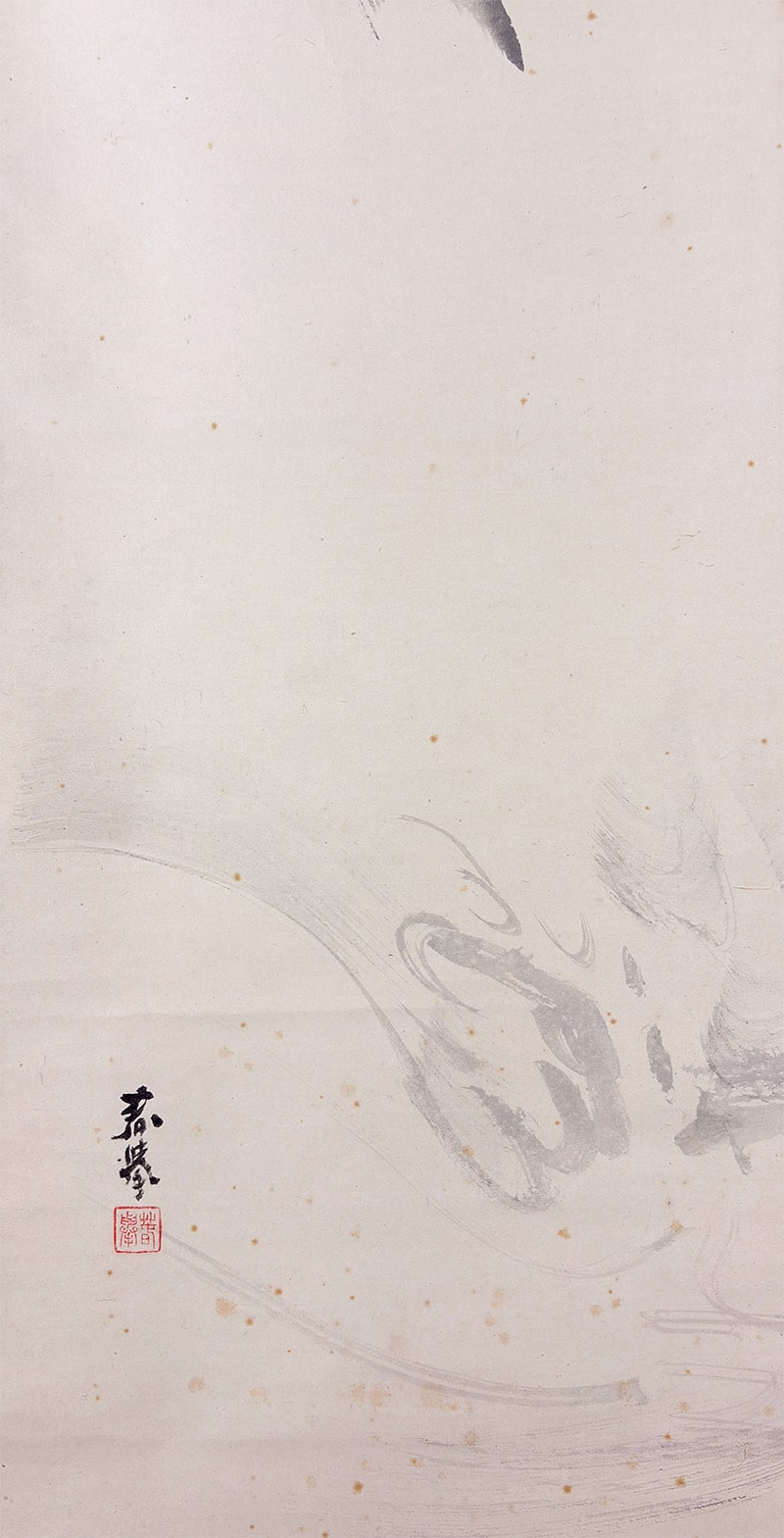 ●墨の濃淡を巧みに使い分け、体幹には深い墨を置き、ひれ先に向かうほど淡墨へと移ろうことで、水を切って進む重量感と、上昇する動きの軽やかさが見事に表現されています。