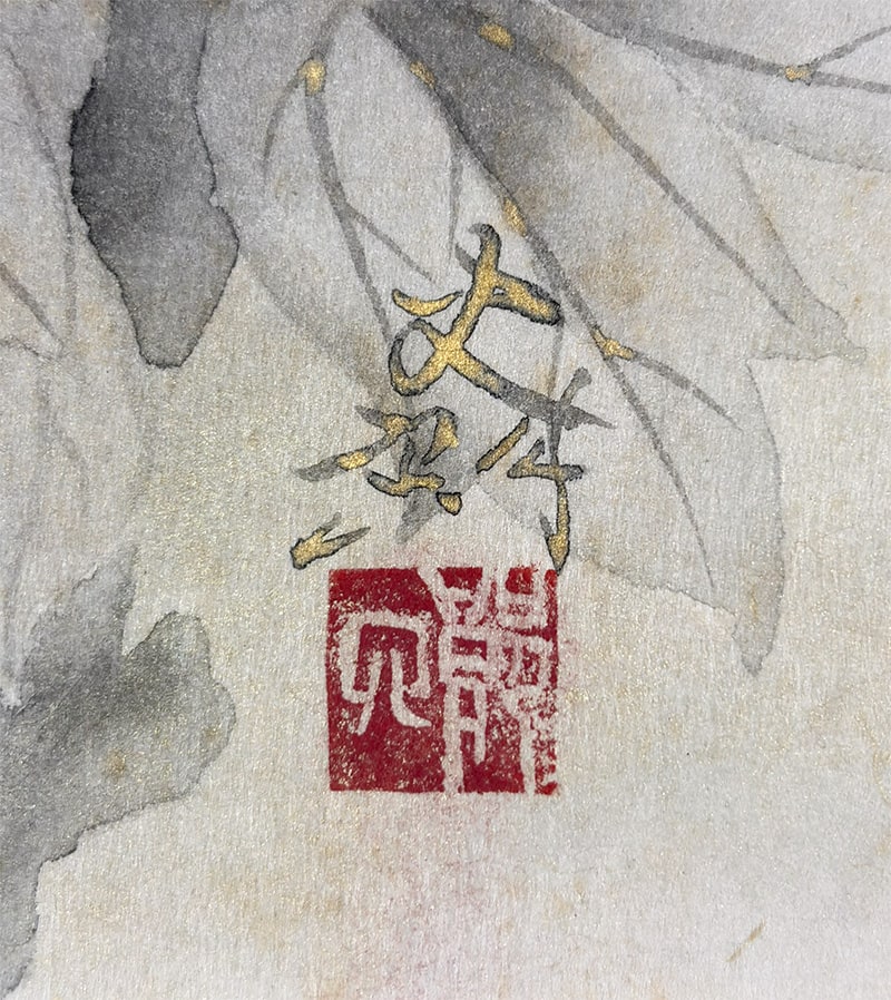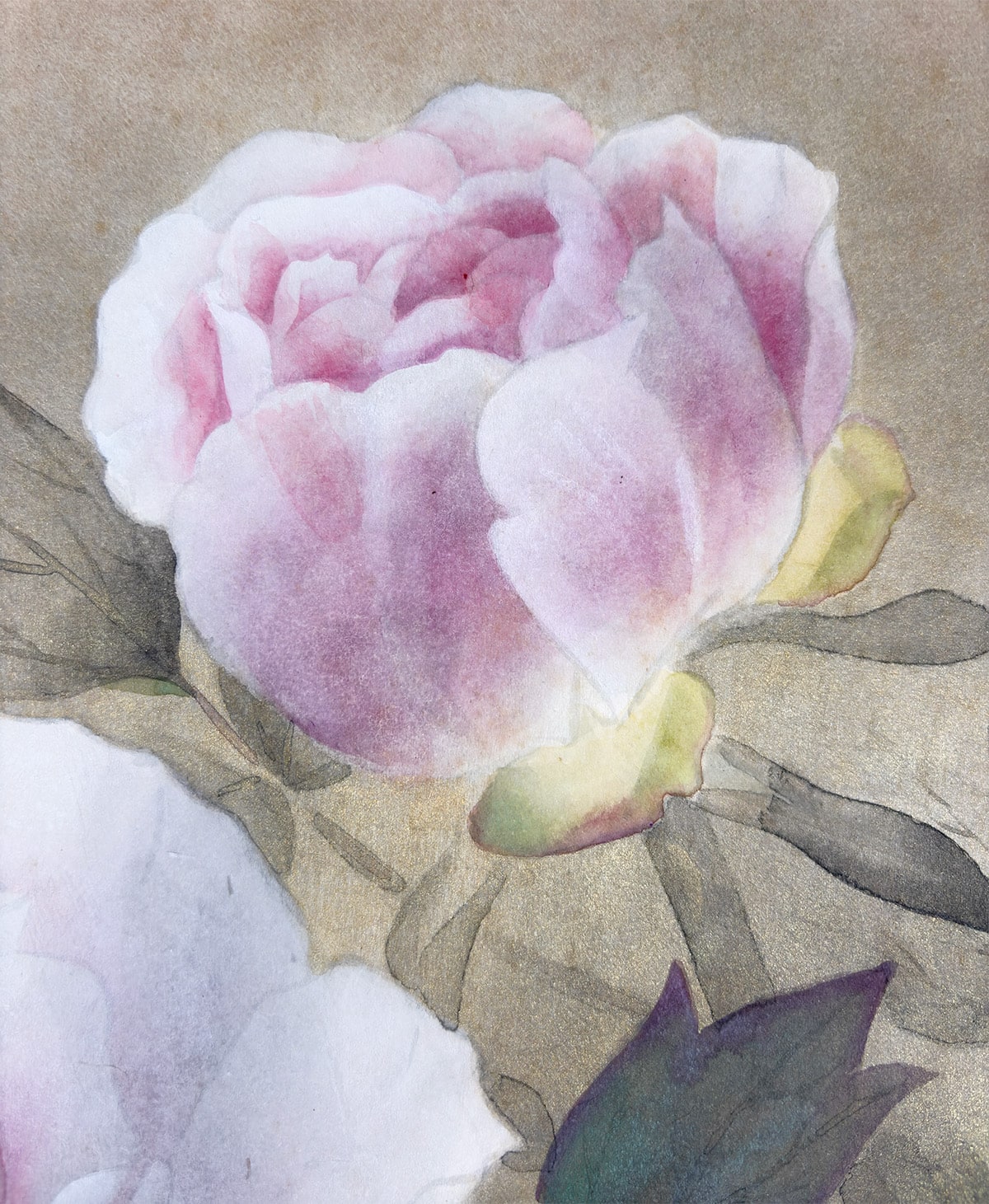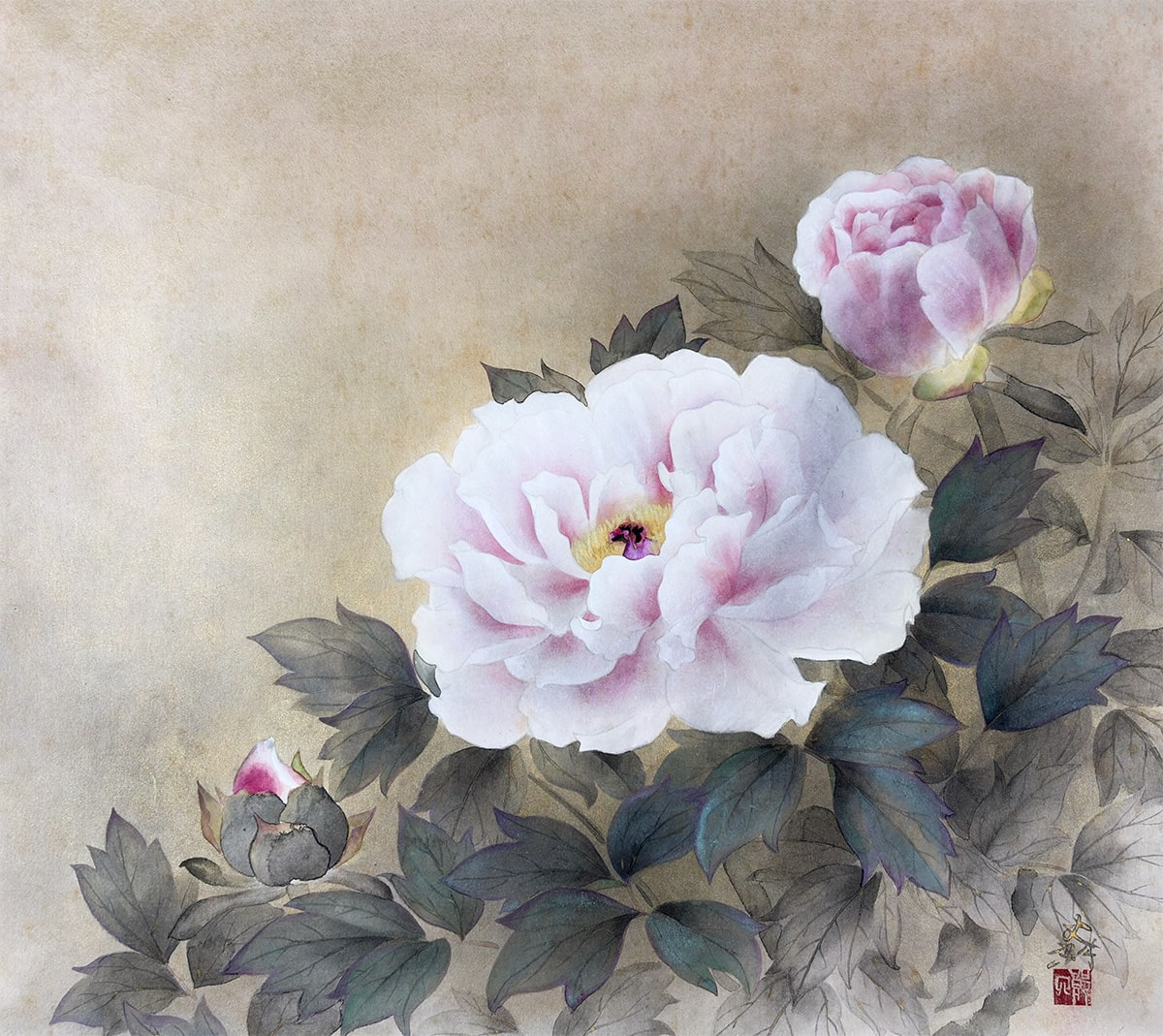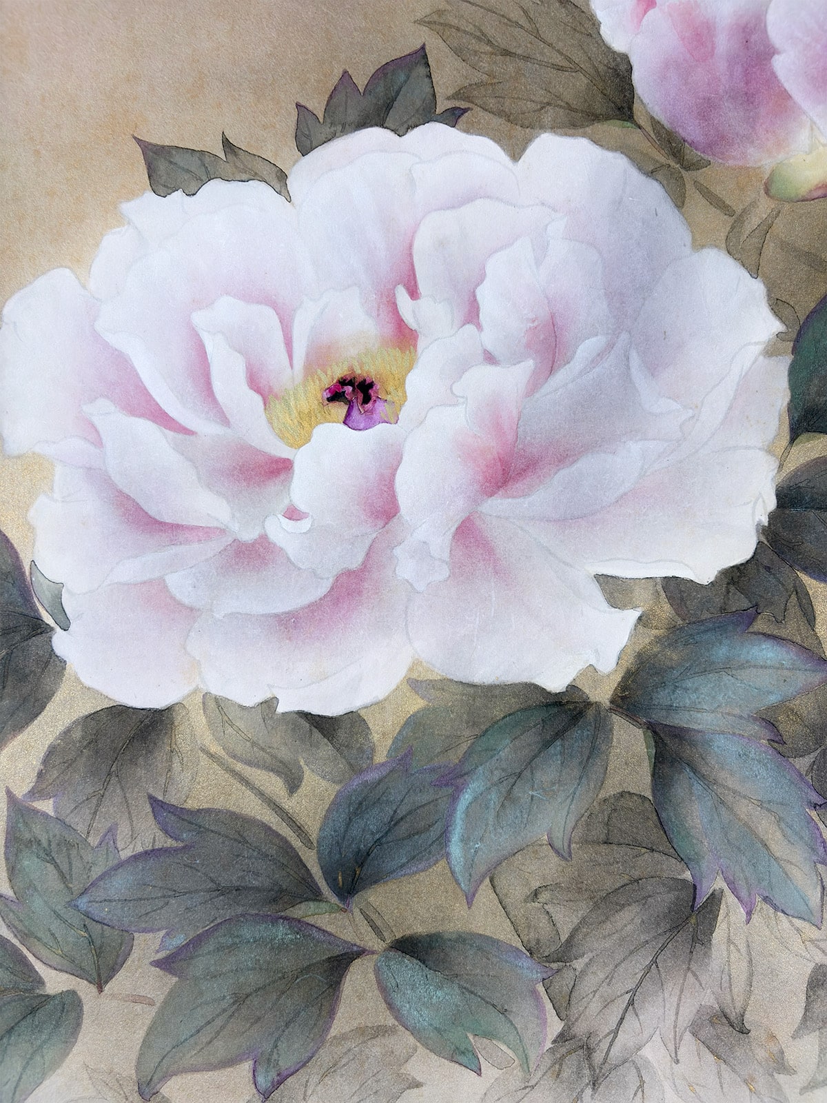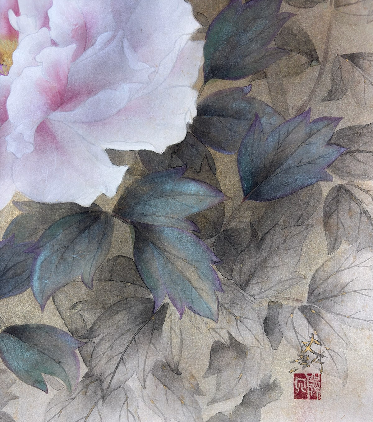 ●花弁の重なりは一枚ずつ丁寧に描写され、淡紅から白へと溶けるような色の移ろいが、牡丹特有の気品をそのまま伝えています。