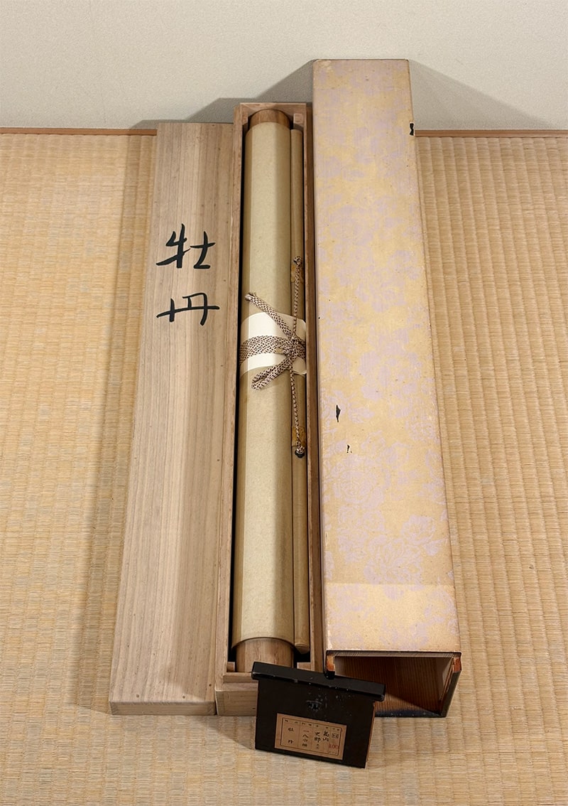 ●牡丹は古来より「富貴」「幸福」「吉祥」を象徴する花として親しまれ、床の間はもちろん、玄関・応接間などにもよく映える題材です。落ち着いた表具が作品の優雅さを引き立て、季節を問わず飾りやすい一幅に仕上がっています。