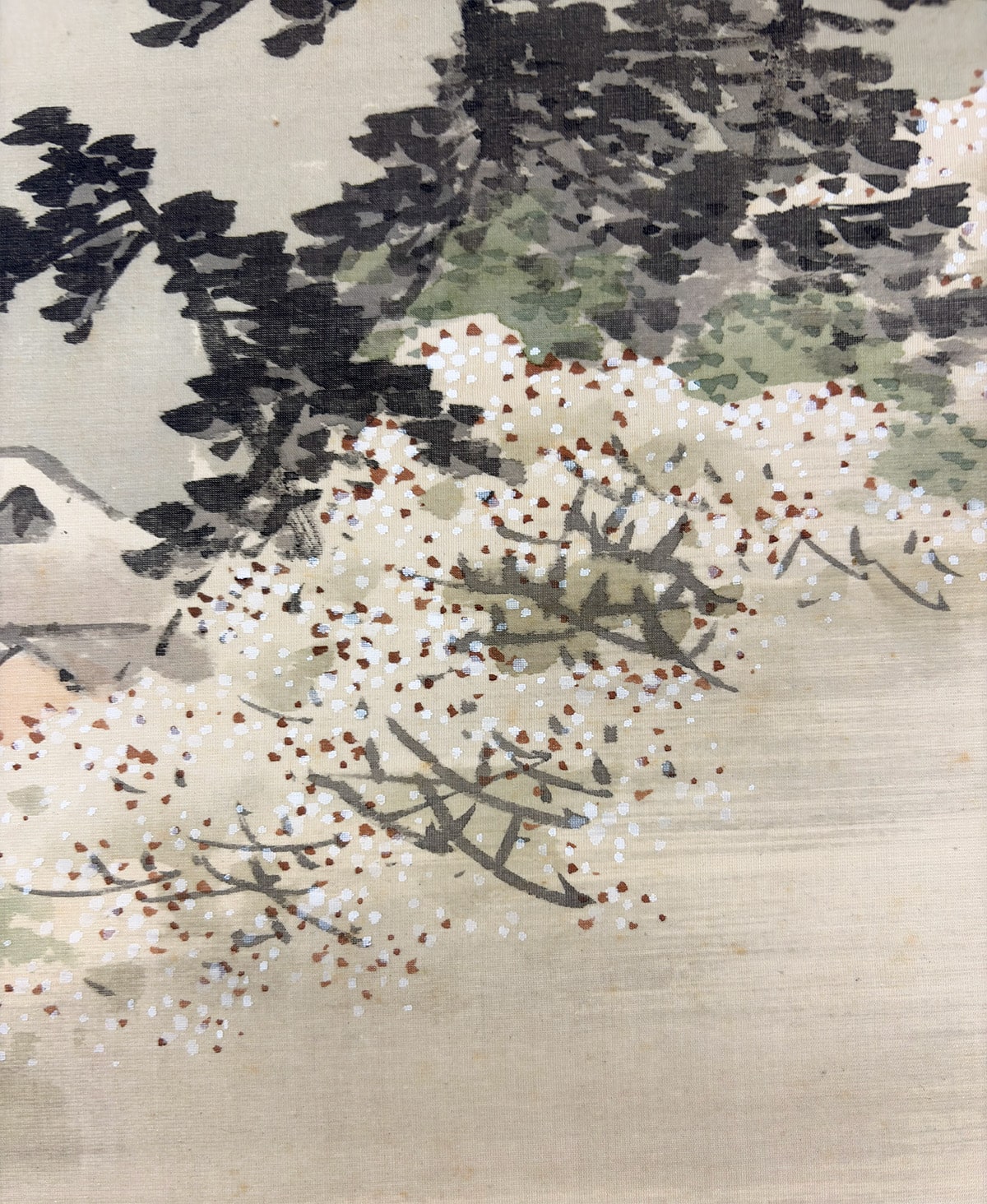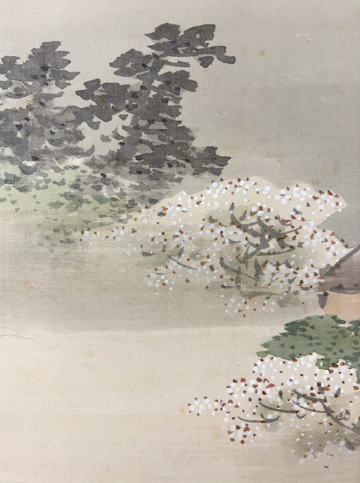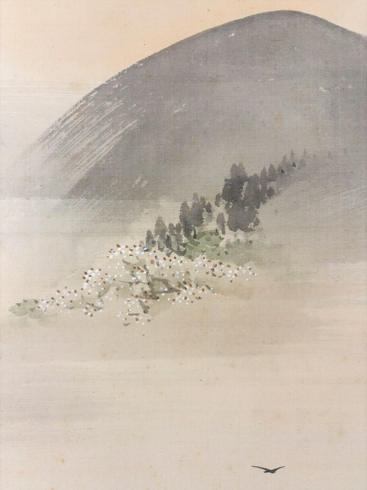 ●本作にもその特徴がよく表れ、淡墨と薄彩を巧みに重ねることで、春特有の柔らかな空気感を見事に表現しています。
