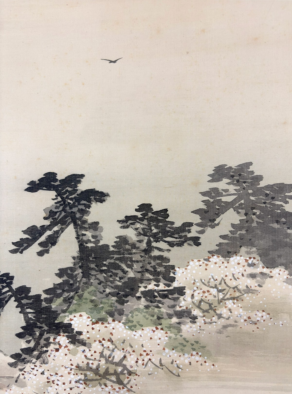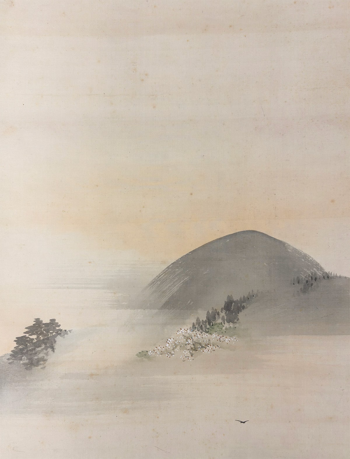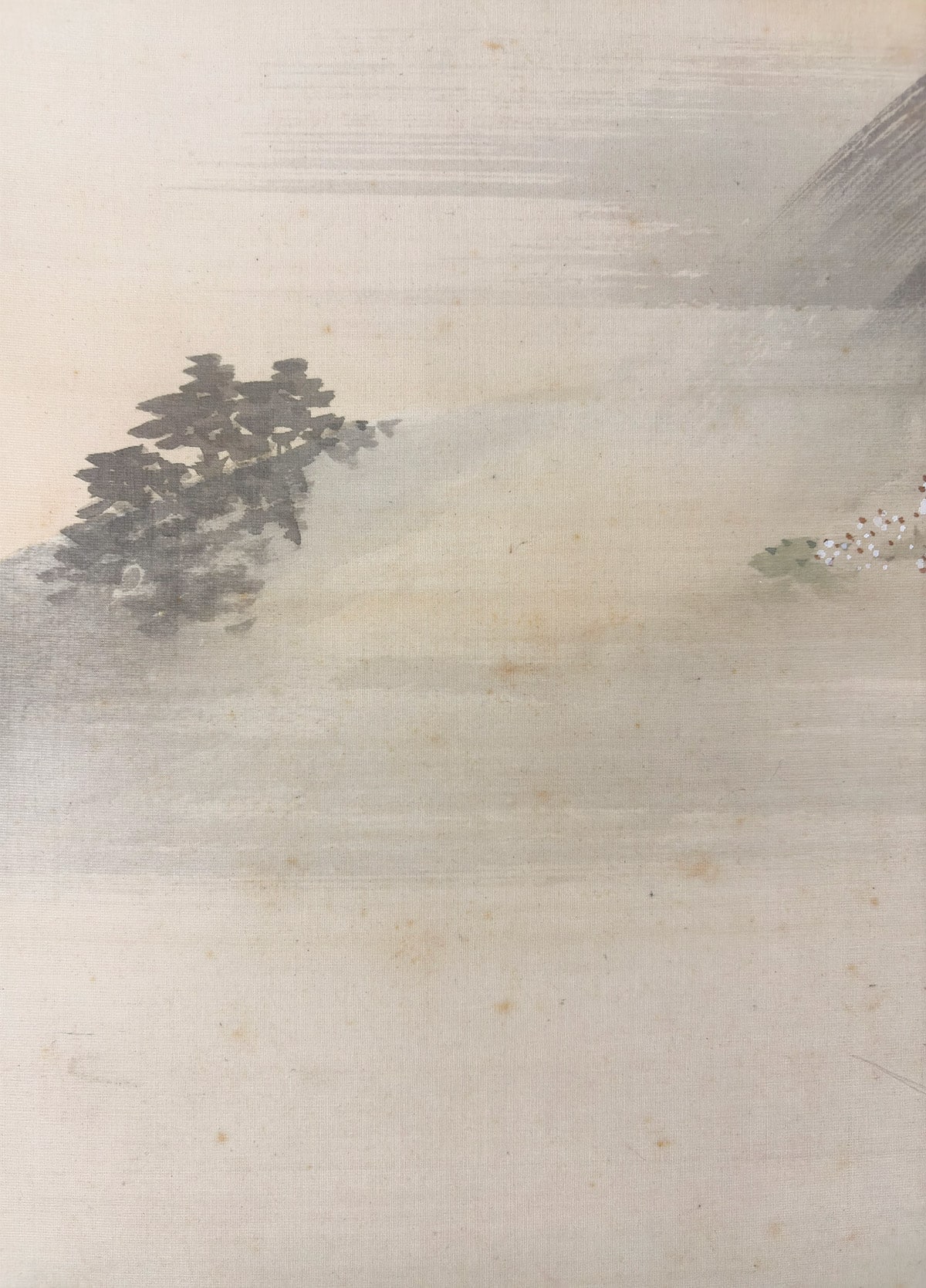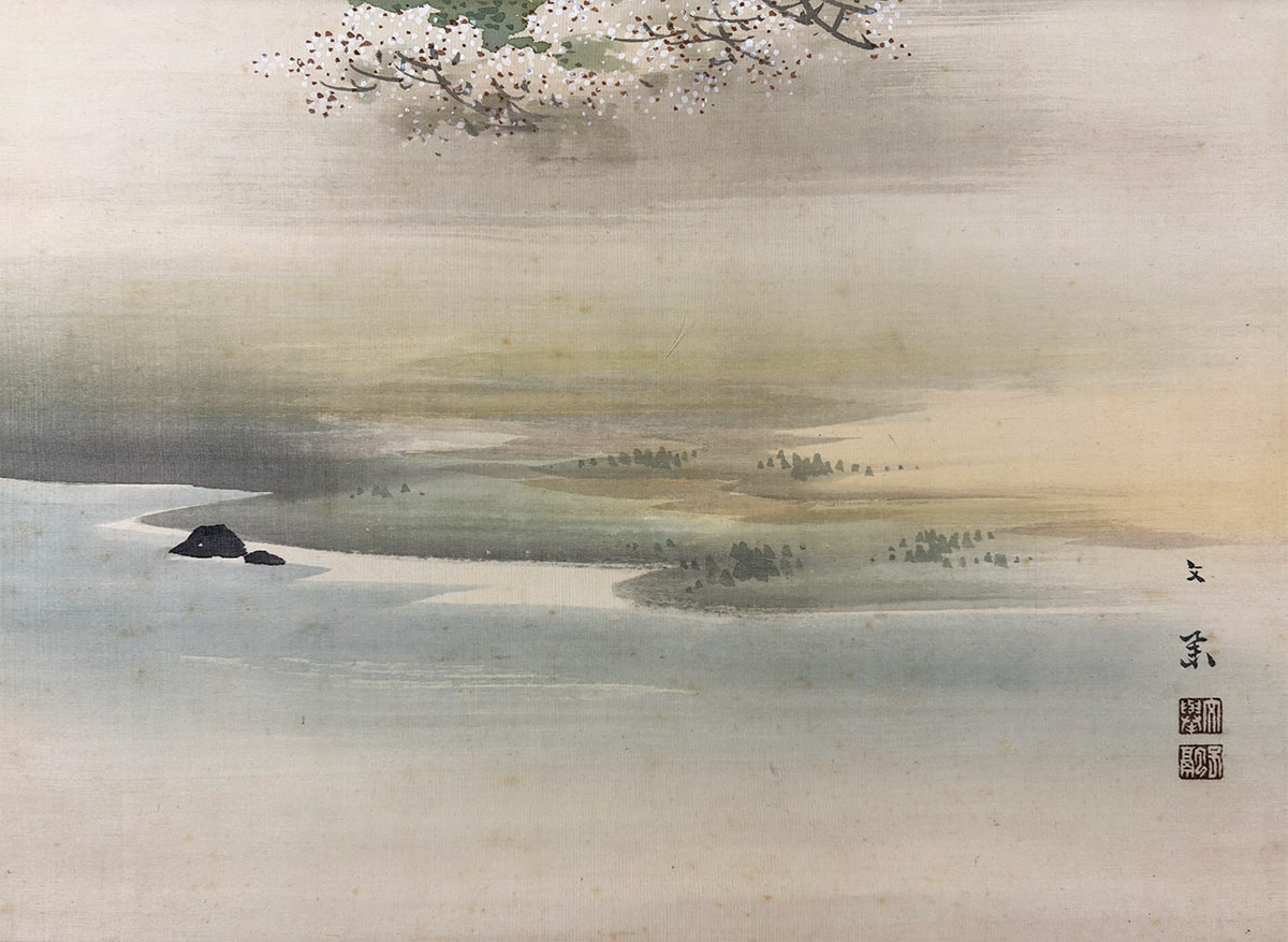 ●本作にもその特徴がよく表れ、淡墨と薄彩を巧みに重ねることで、春特有の柔らかな空気感を見事に表現しています。