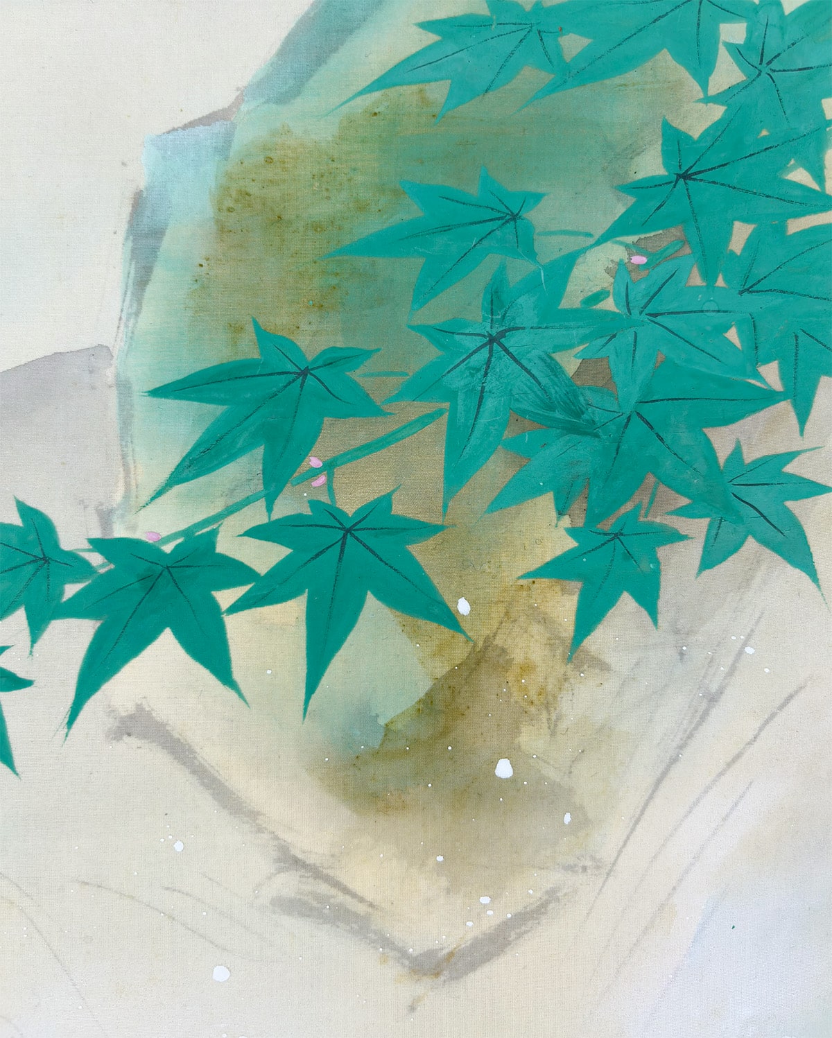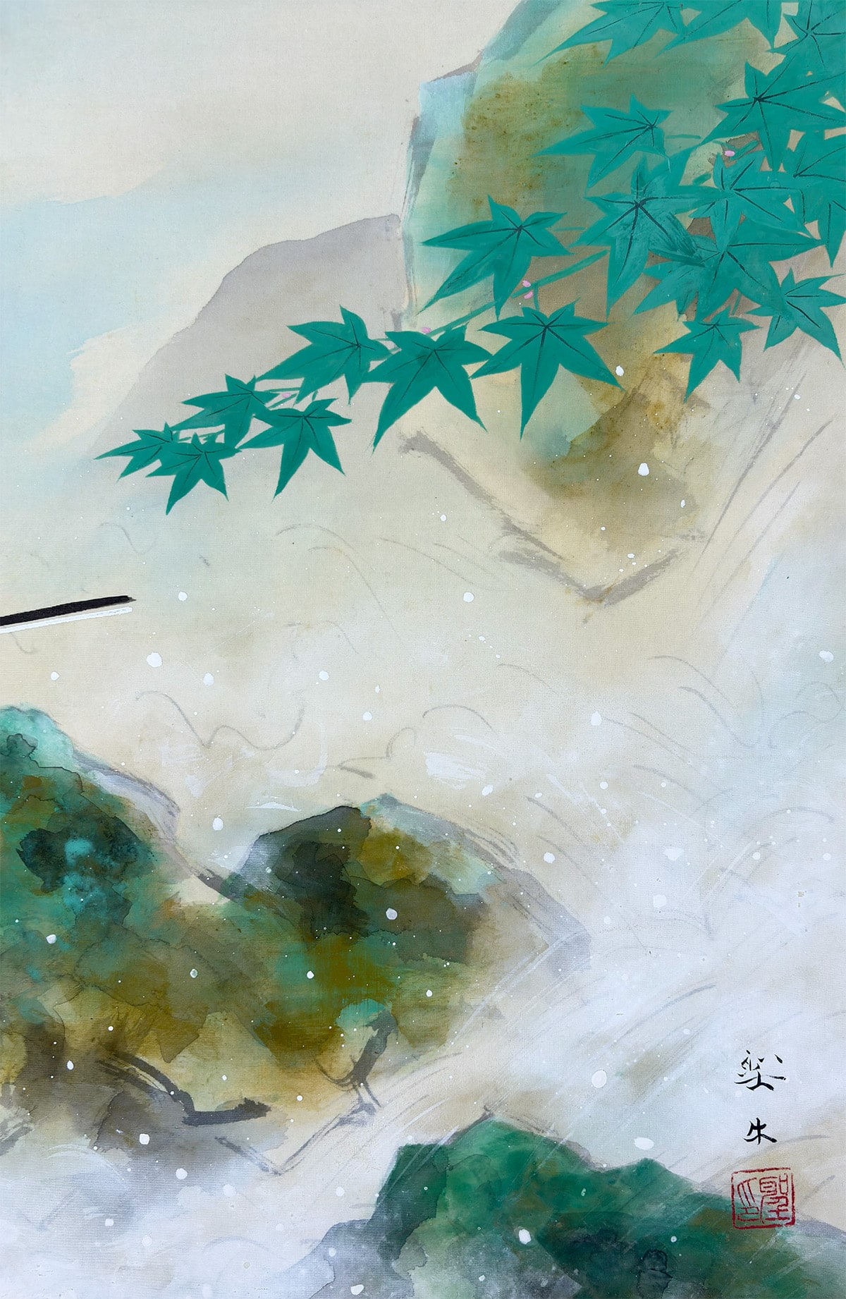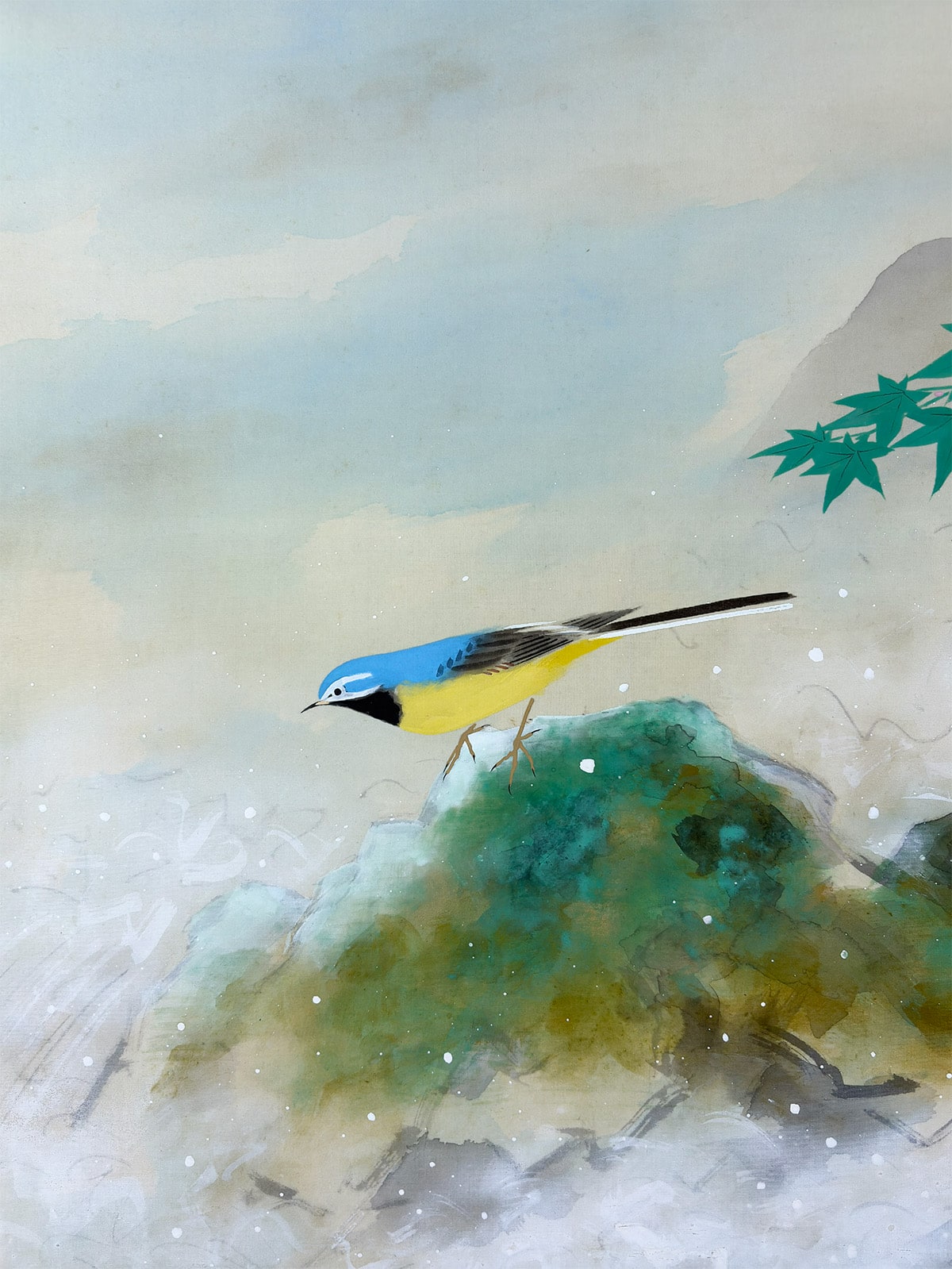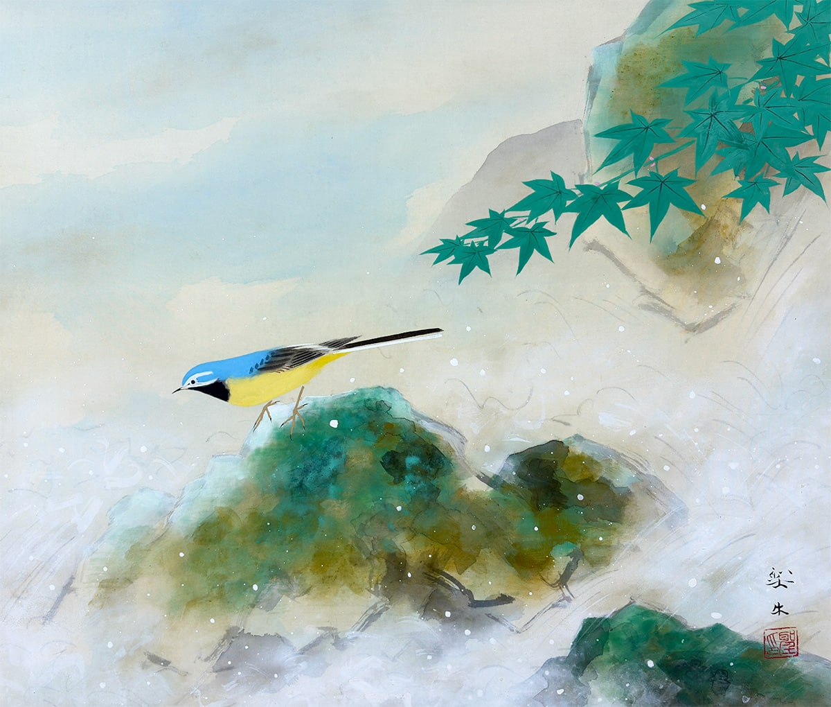 ●淡い霞の表現が奥行きを生み、鳥の柔らかな羽色と楓の清涼な緑が調和し、静けさの中に生命の息づかいが感じられます。