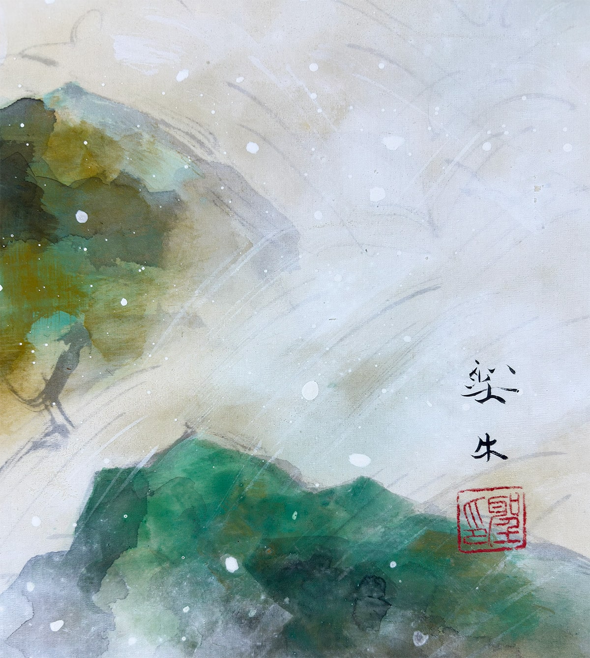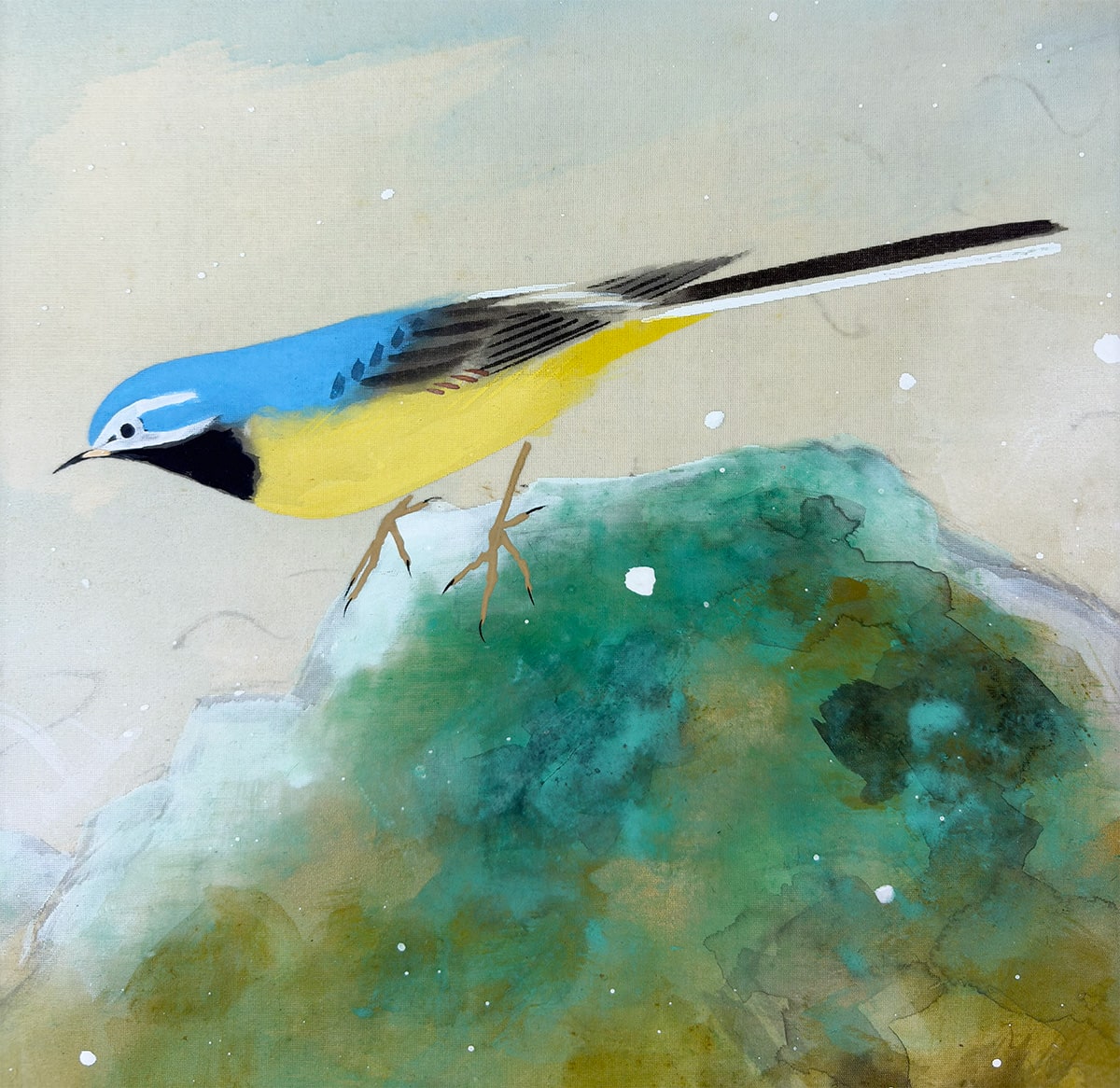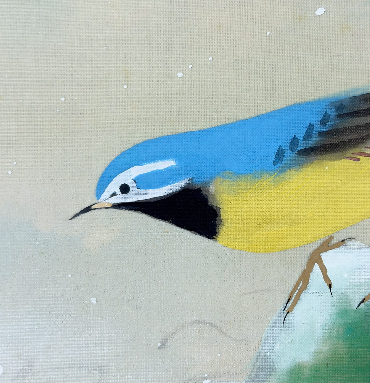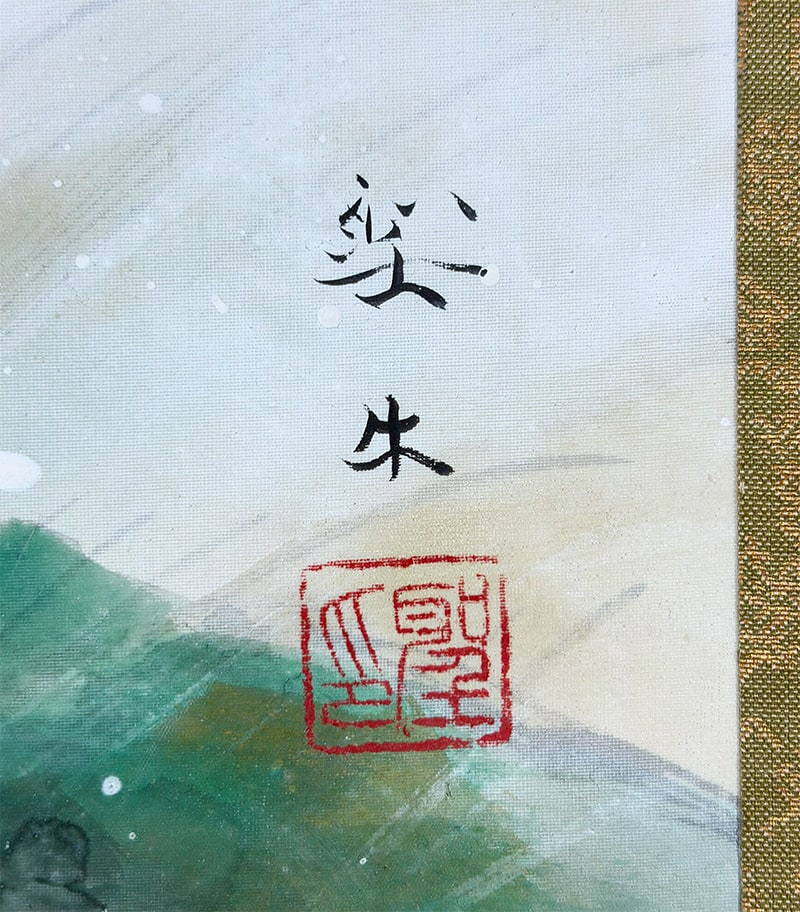 ●淡い霞の表現が奥行きを生み、鳥の柔らかな羽色と楓の清涼な緑が調和し、静けさの中に生命の息づかいが感じられます。