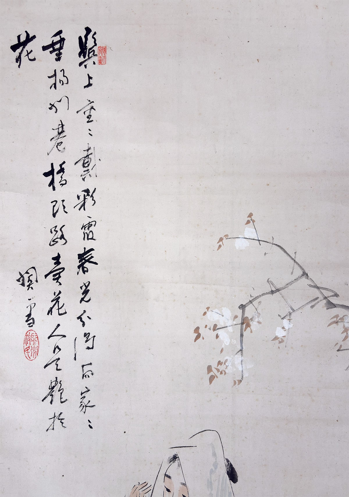 ●上部には彩霞や春光、花売りの娘を詠んだ春景の四句が記され、画中の道行きを華やかに広げています。