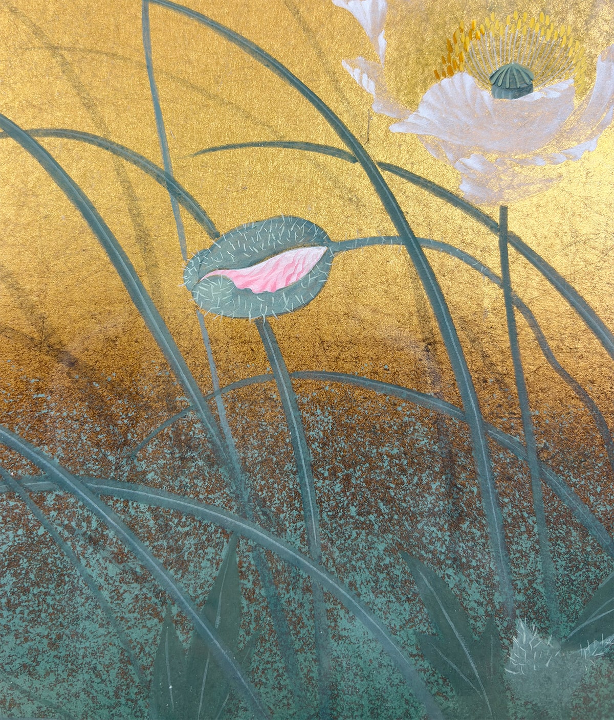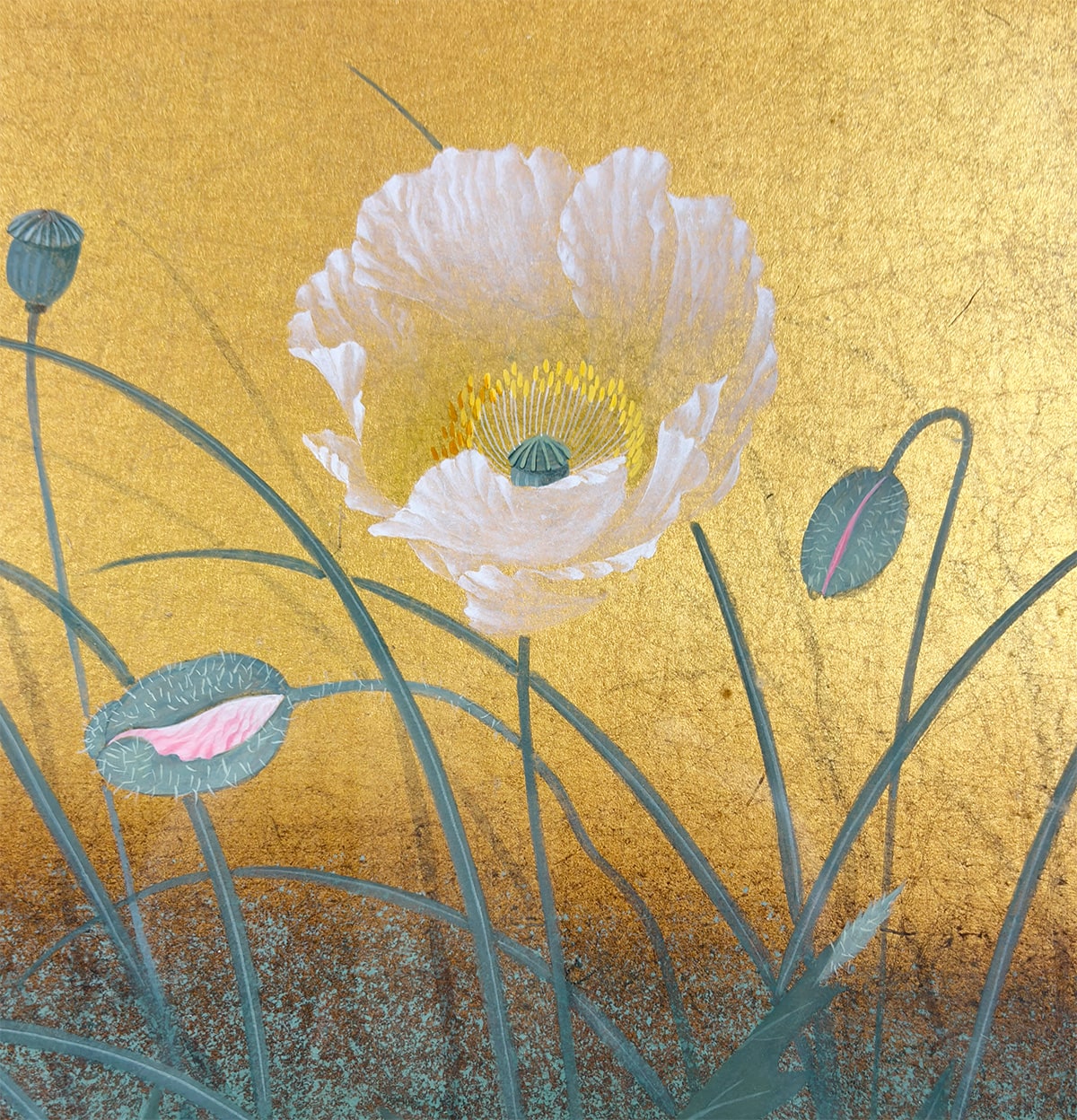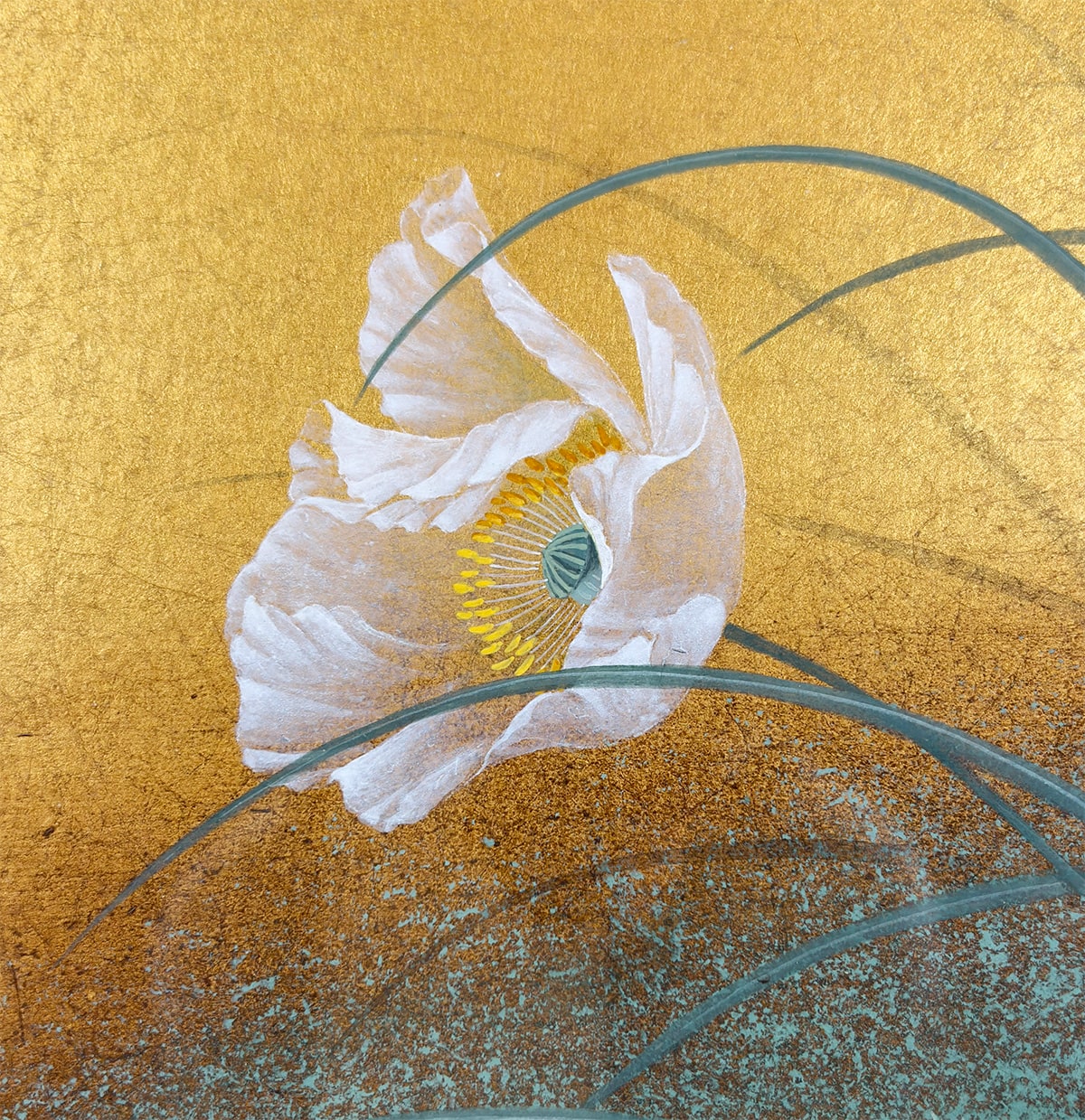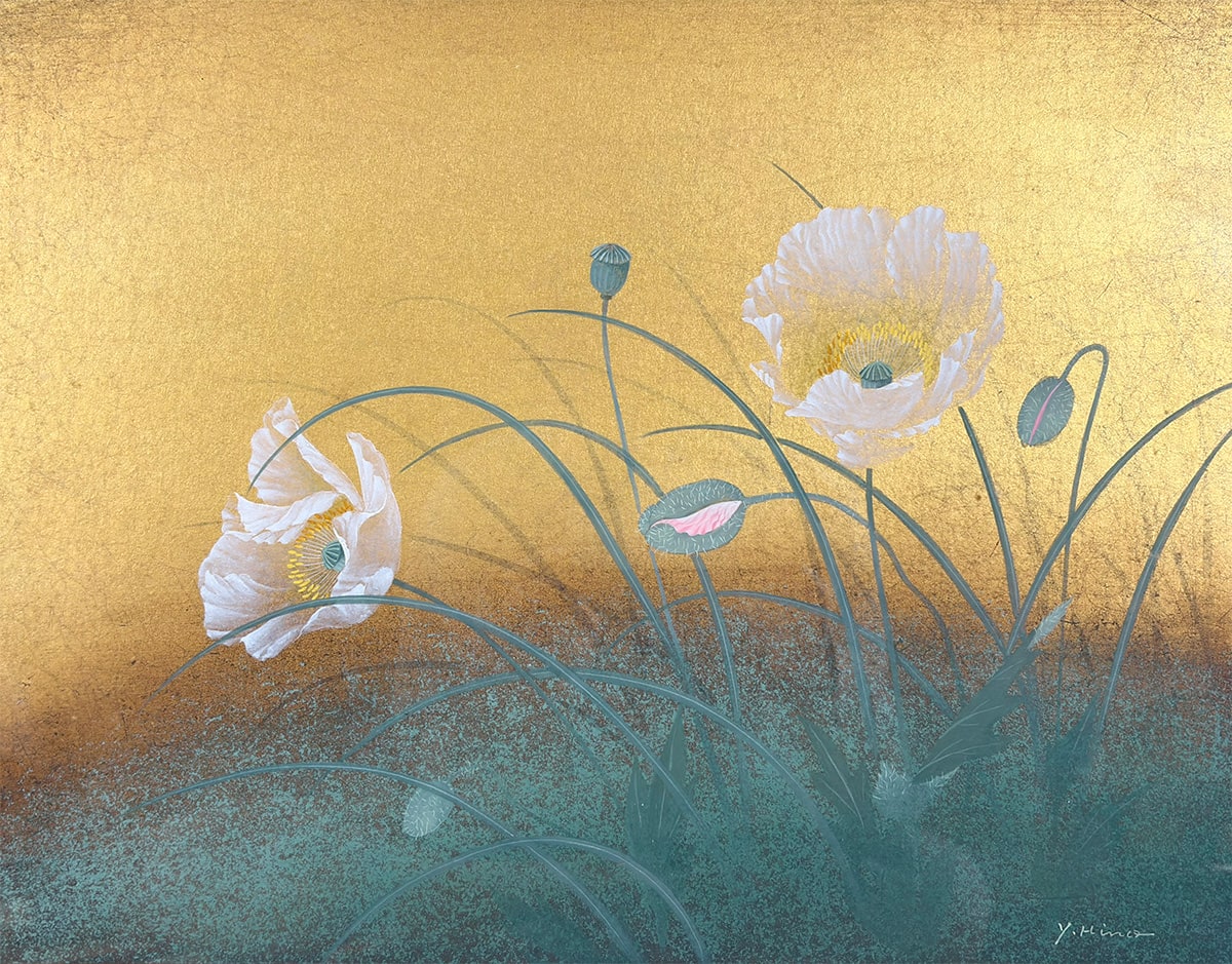 ●金地の柔らかな輝きを背景に、白い芥子の花を清らかに描いた樋野康郎先生の油彩6号作品です。