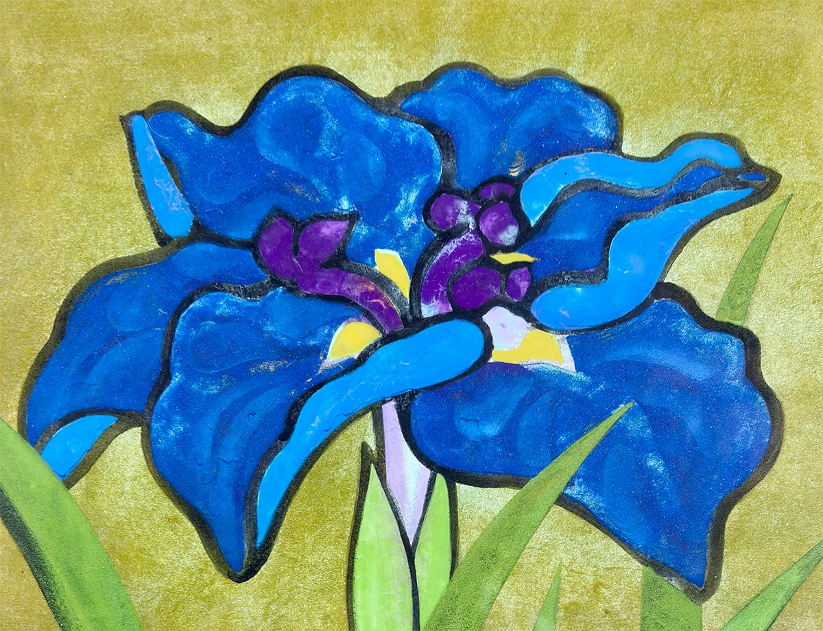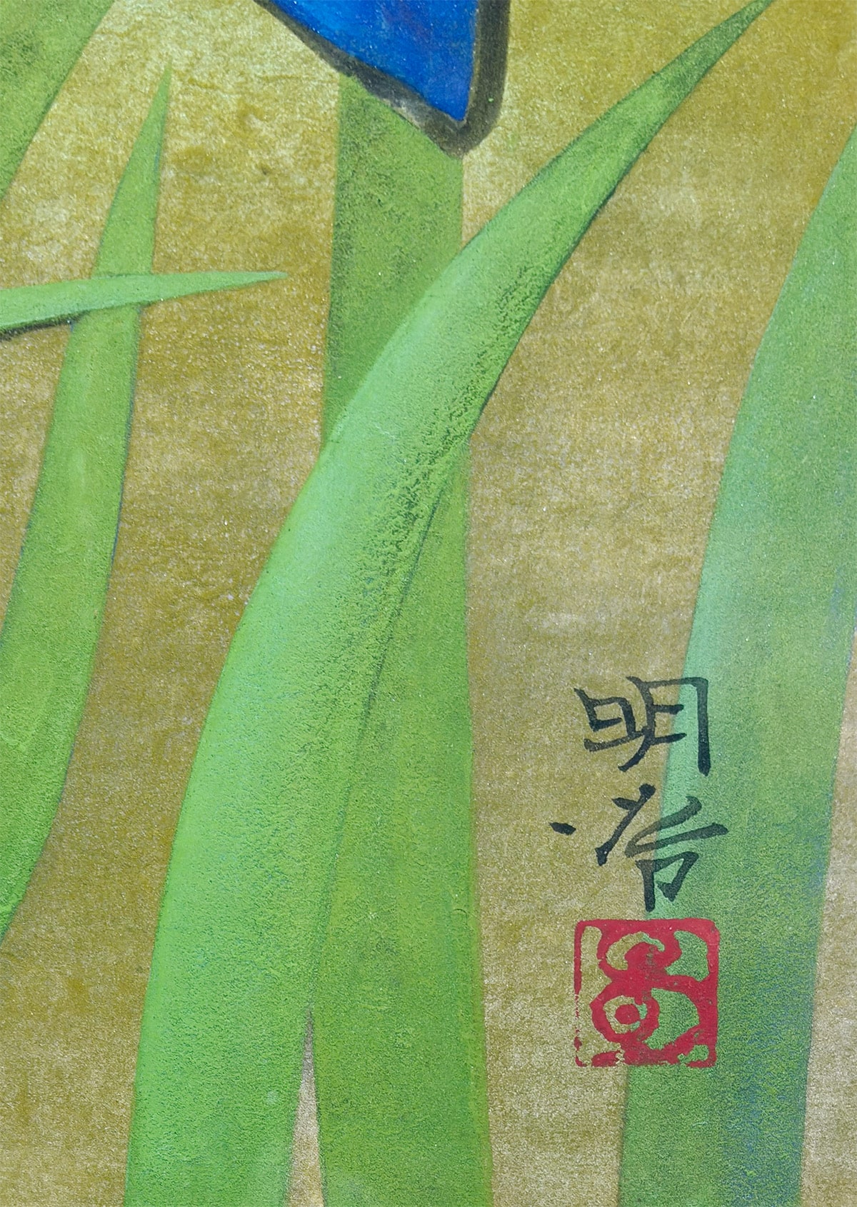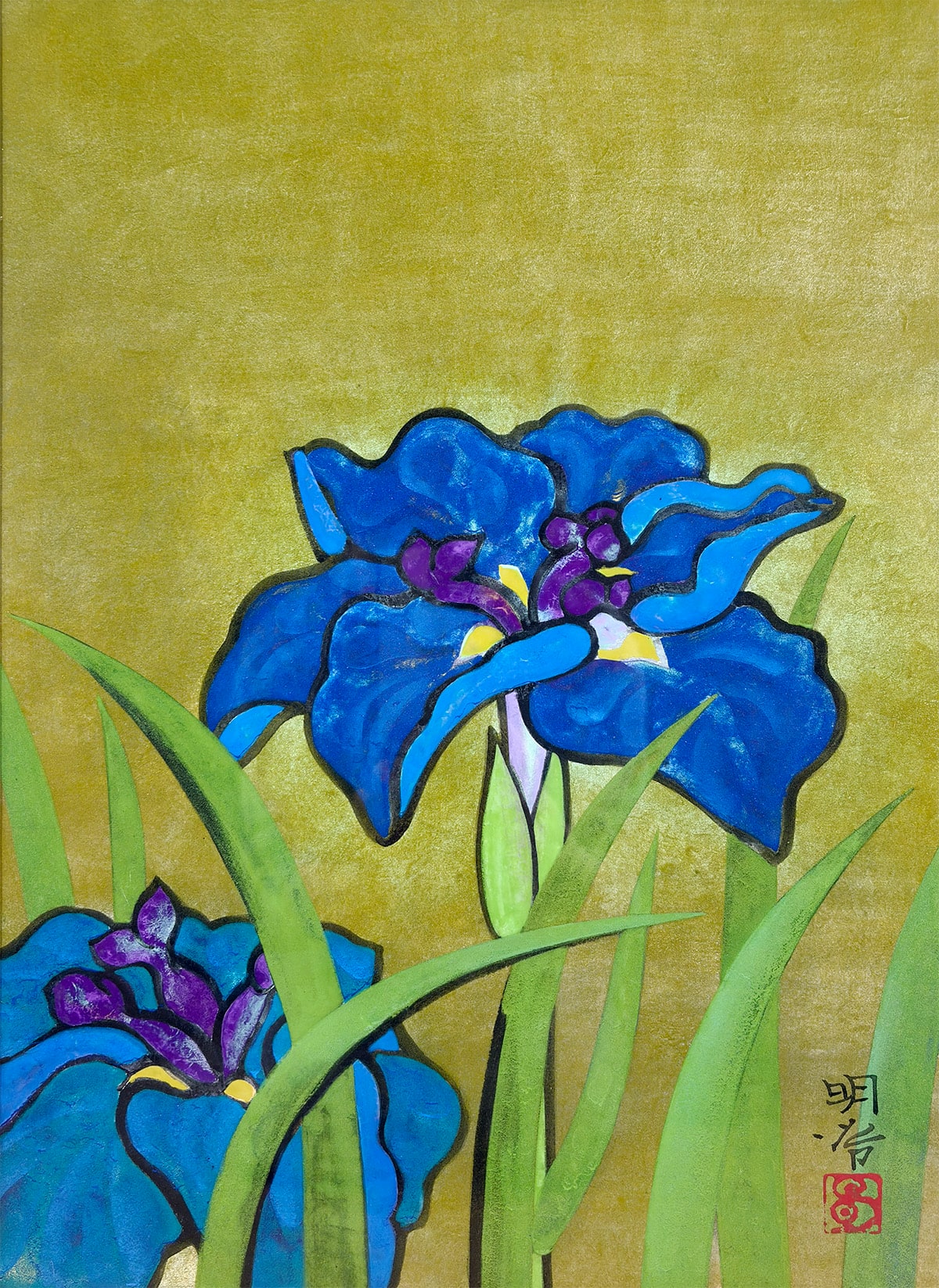 ●本作は日本画家・橋本明治先生による《菖蒲》の一作で、凛と立つ二輪の菖蒲を藍・紫・緑の鮮やかな色面で描き、背景の柔らかな黄土色との対比によって花姿を際立たせています。
