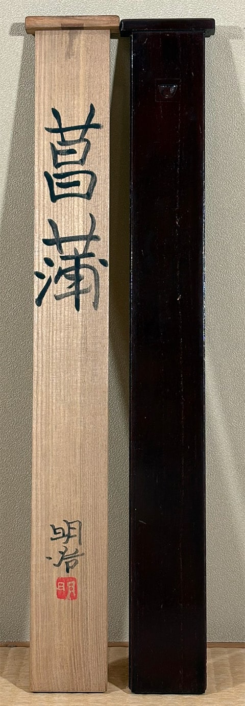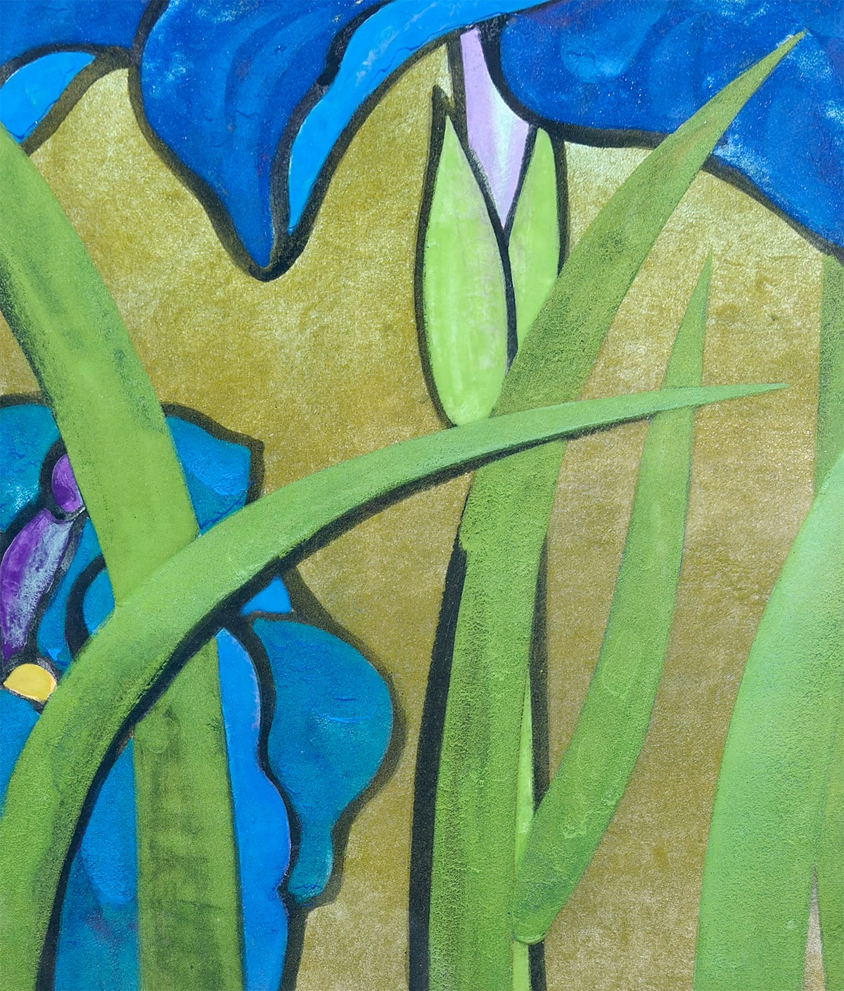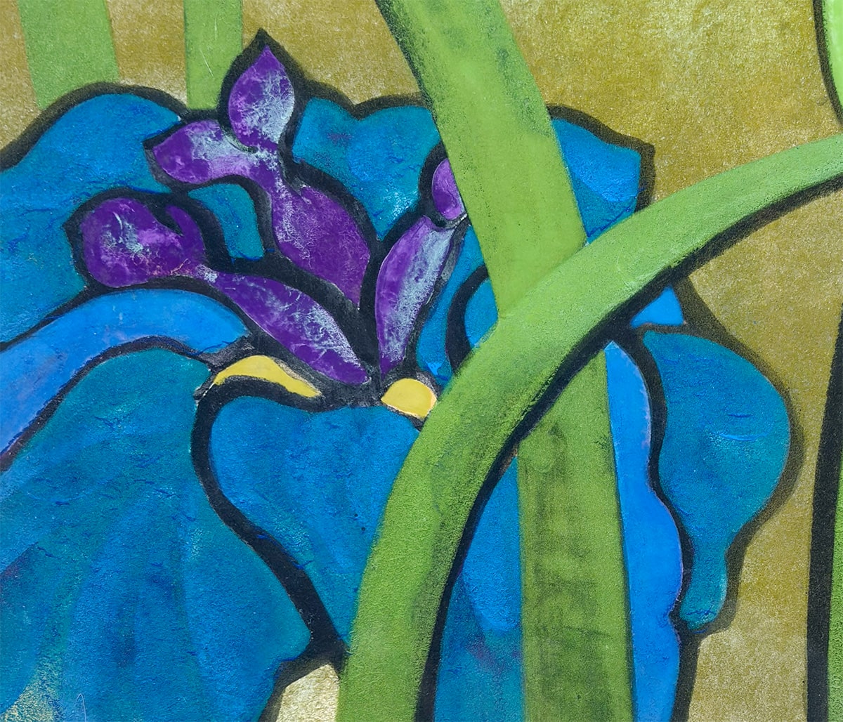 ●本作は日本画家・橋本明治先生による《菖蒲》の一作で、凛と立つ二輪の菖蒲を藍・紫・緑の鮮やかな色面で描き、背景の柔らかな黄土色との対比によって花姿を際立たせています。