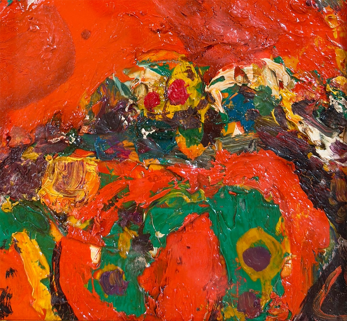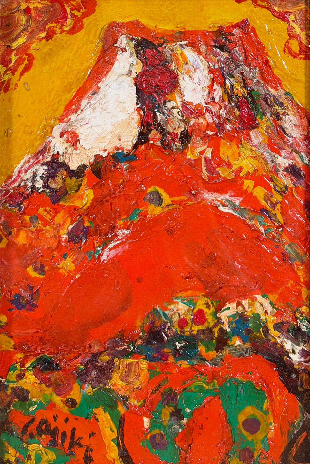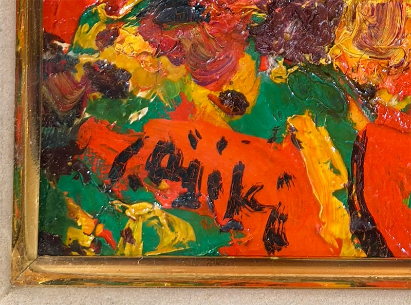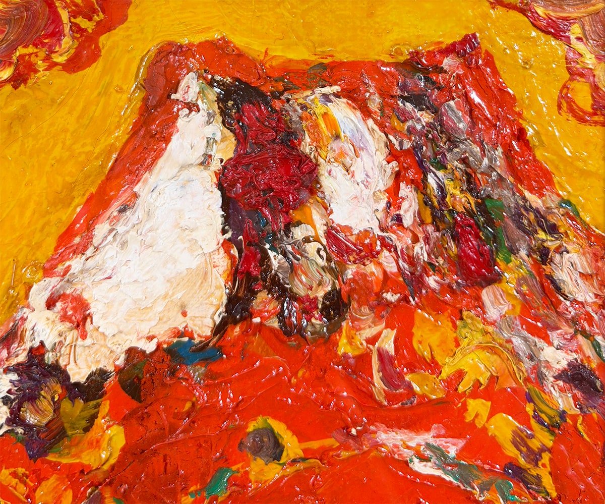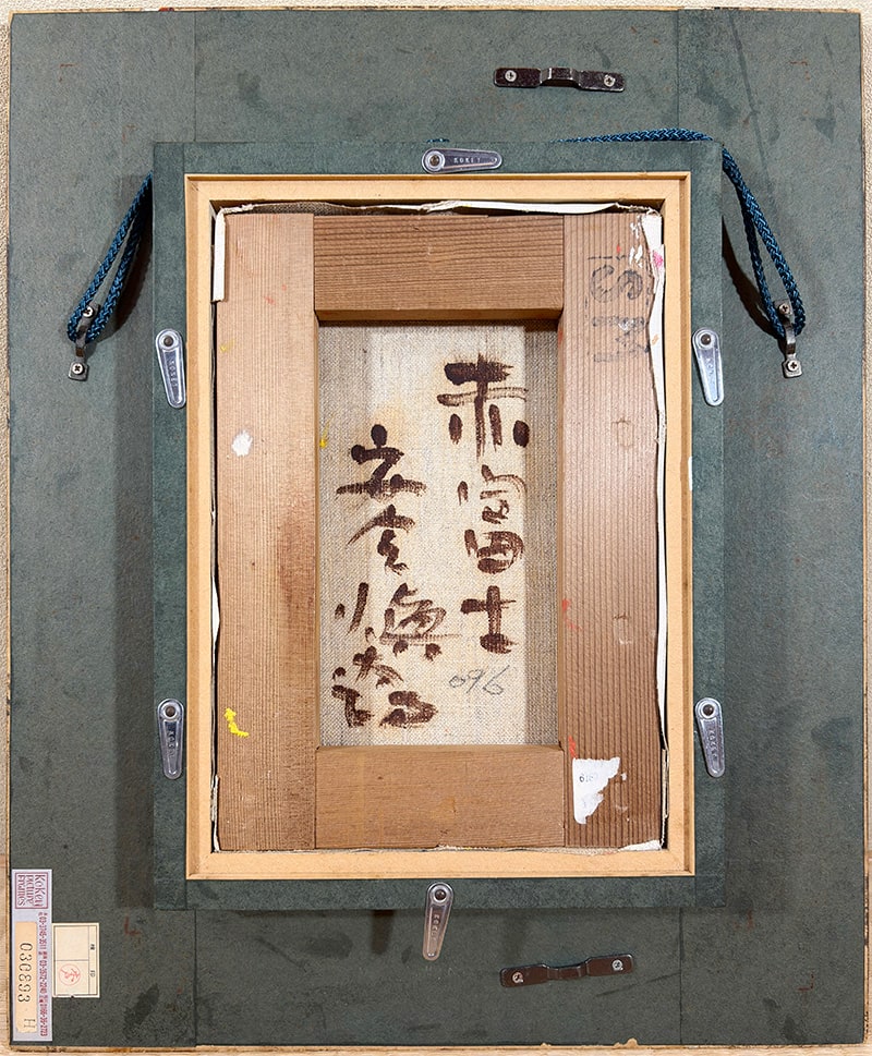●安食作品の特徴である重厚なマチエール(厚塗り)が存分に発揮され、富士の稜線から山肌にかけて、赤・橙・黄の色彩が立体的に盛り上がり、まるで溶岩の熱を帯びたような迫力を感じさせます。