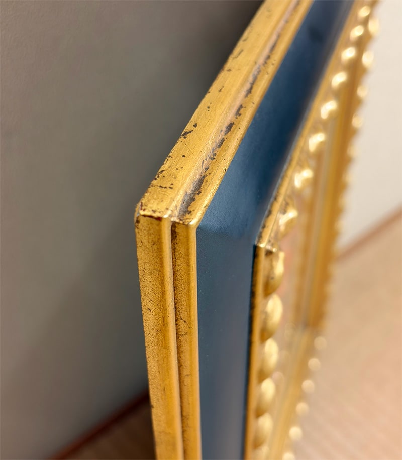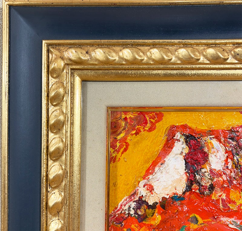 ●額装は落ち着いた金×紺の重厚なフレームで、作品の鮮烈な色彩を引き立てながら、上質な雰囲気にまとめられています。
