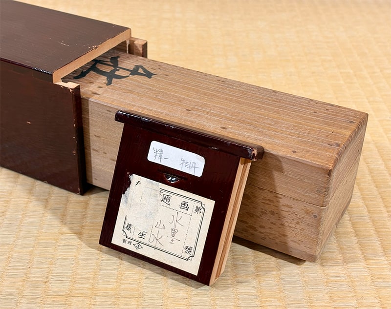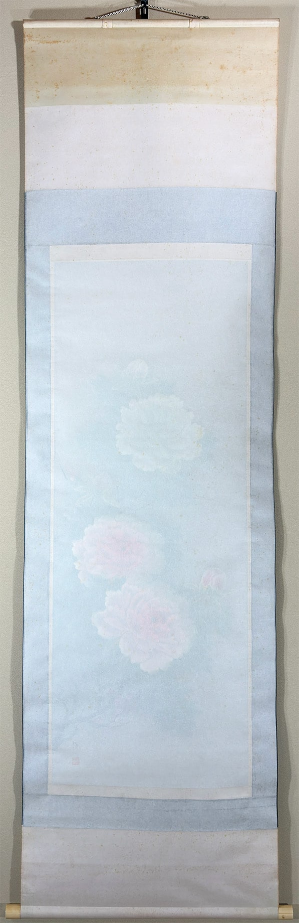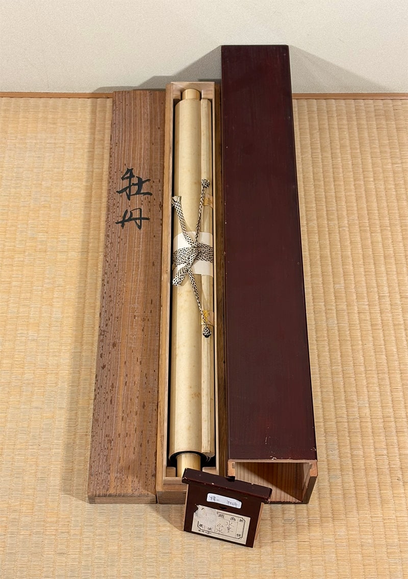 ●表具は金襴裂地を用いながらも主張しすぎず、作品の清らかな雰囲気を引き立てる仕立てになっています。