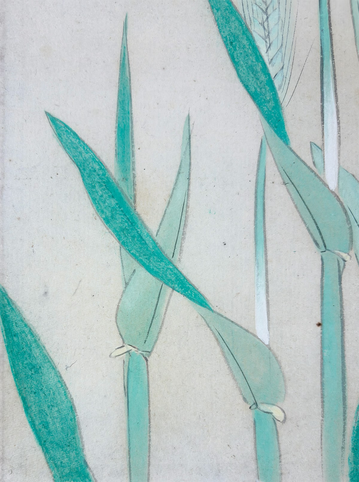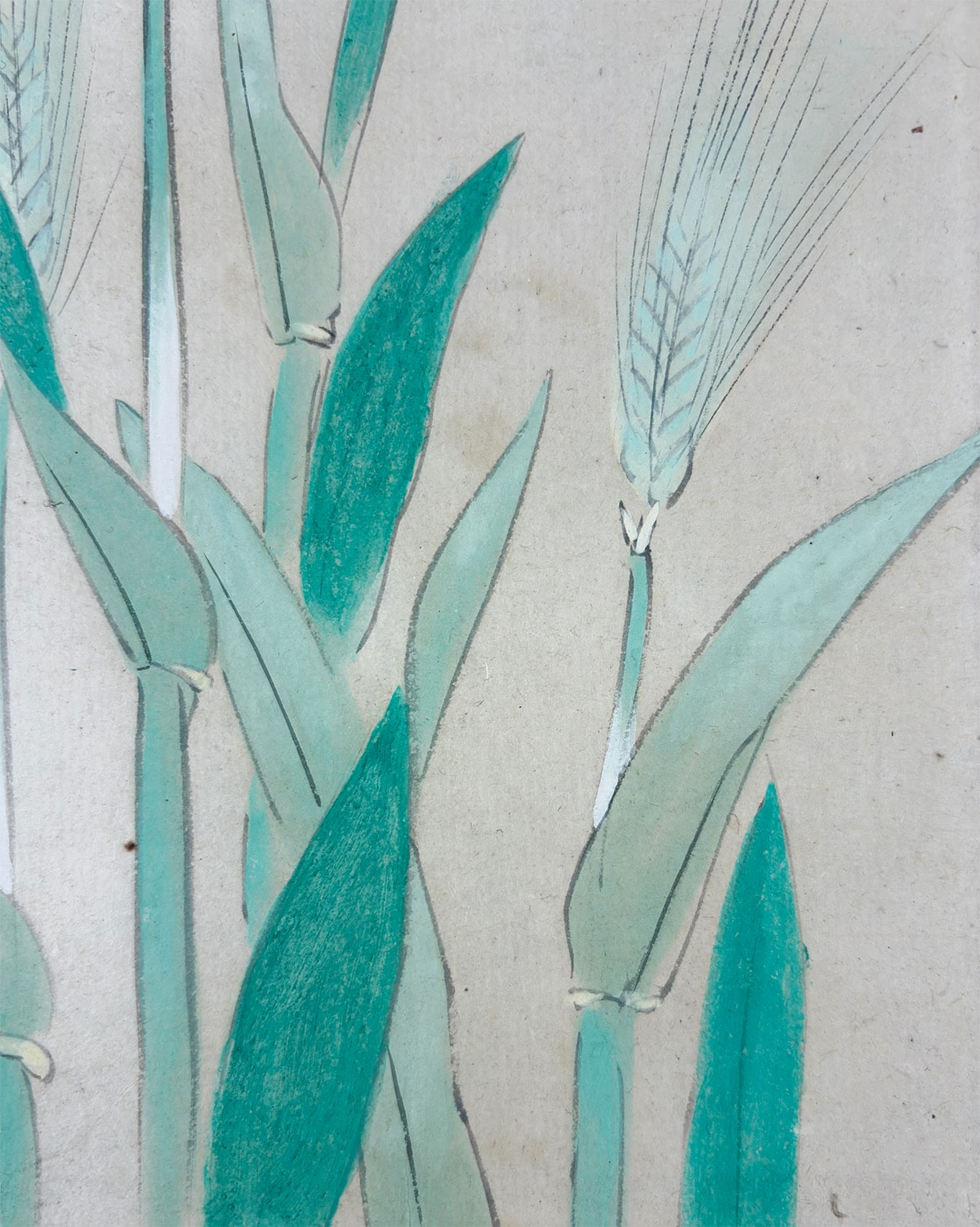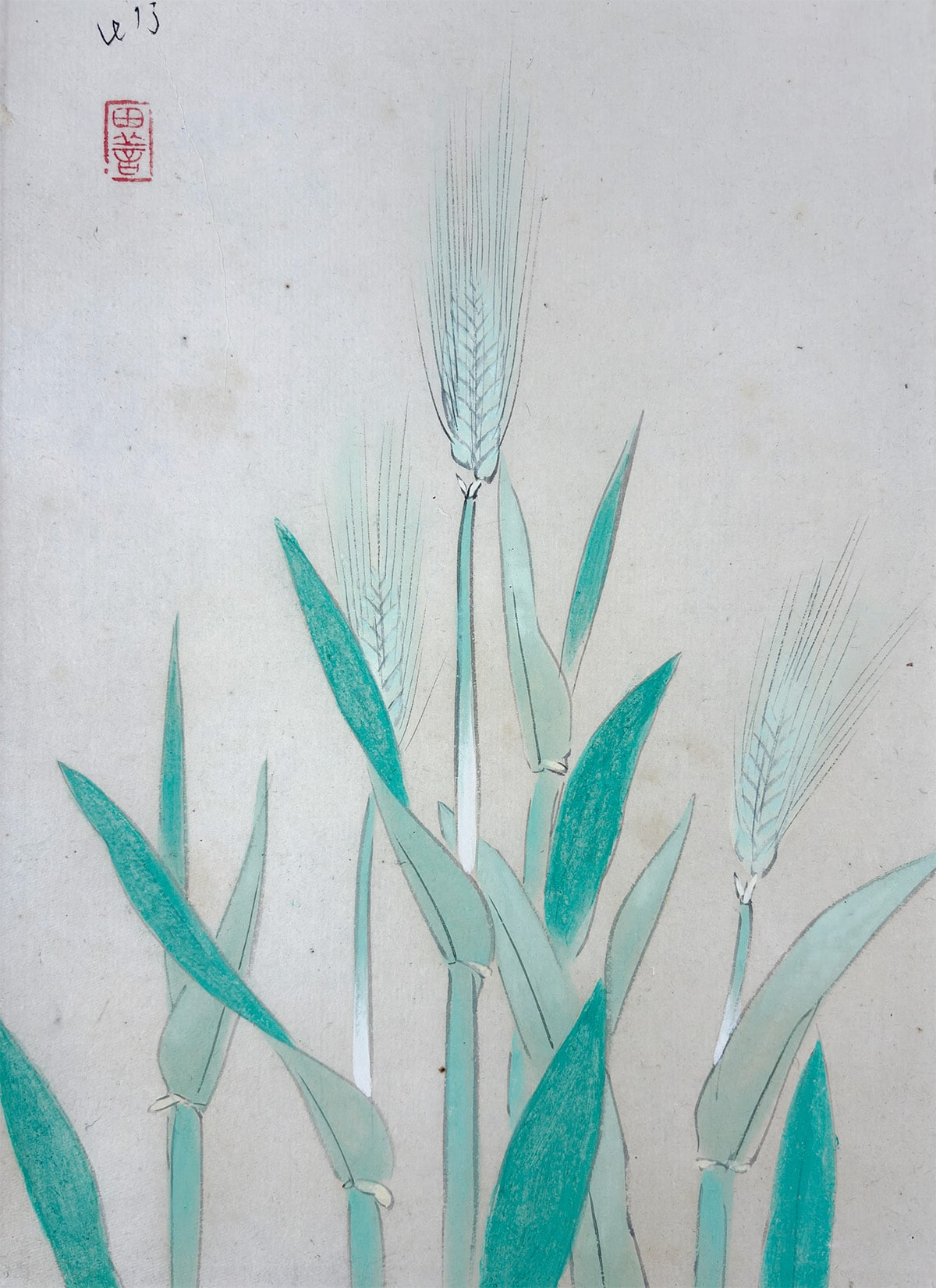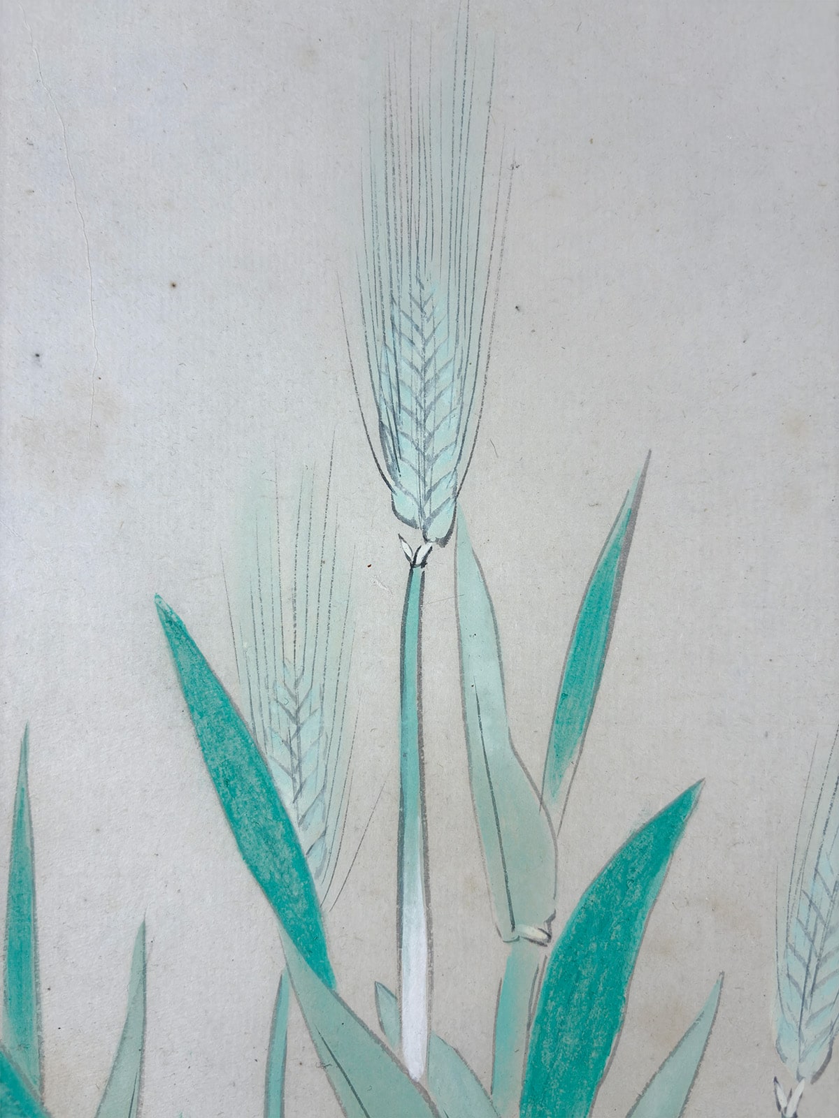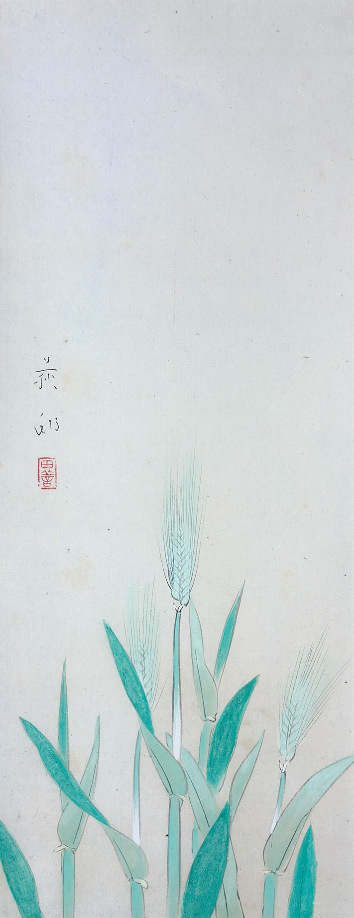 ●本作は、初夏の若い麦がすっと伸びる姿を、淡い青緑の色合いで爽やかに描いた一幅です。