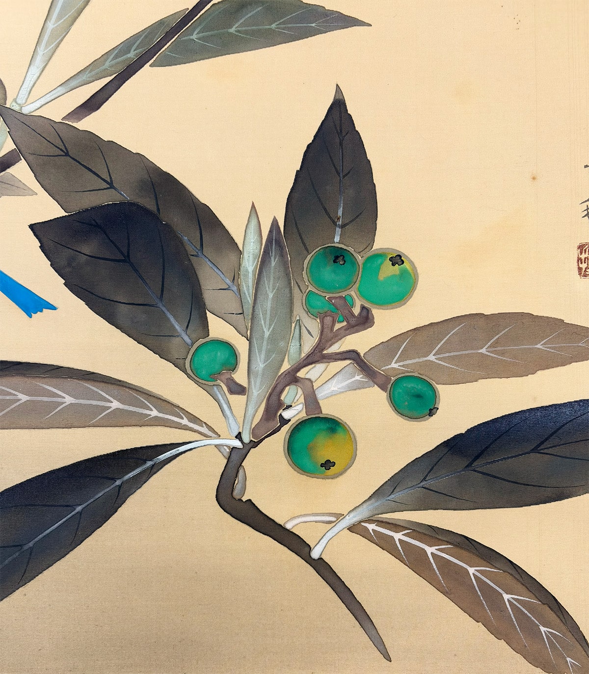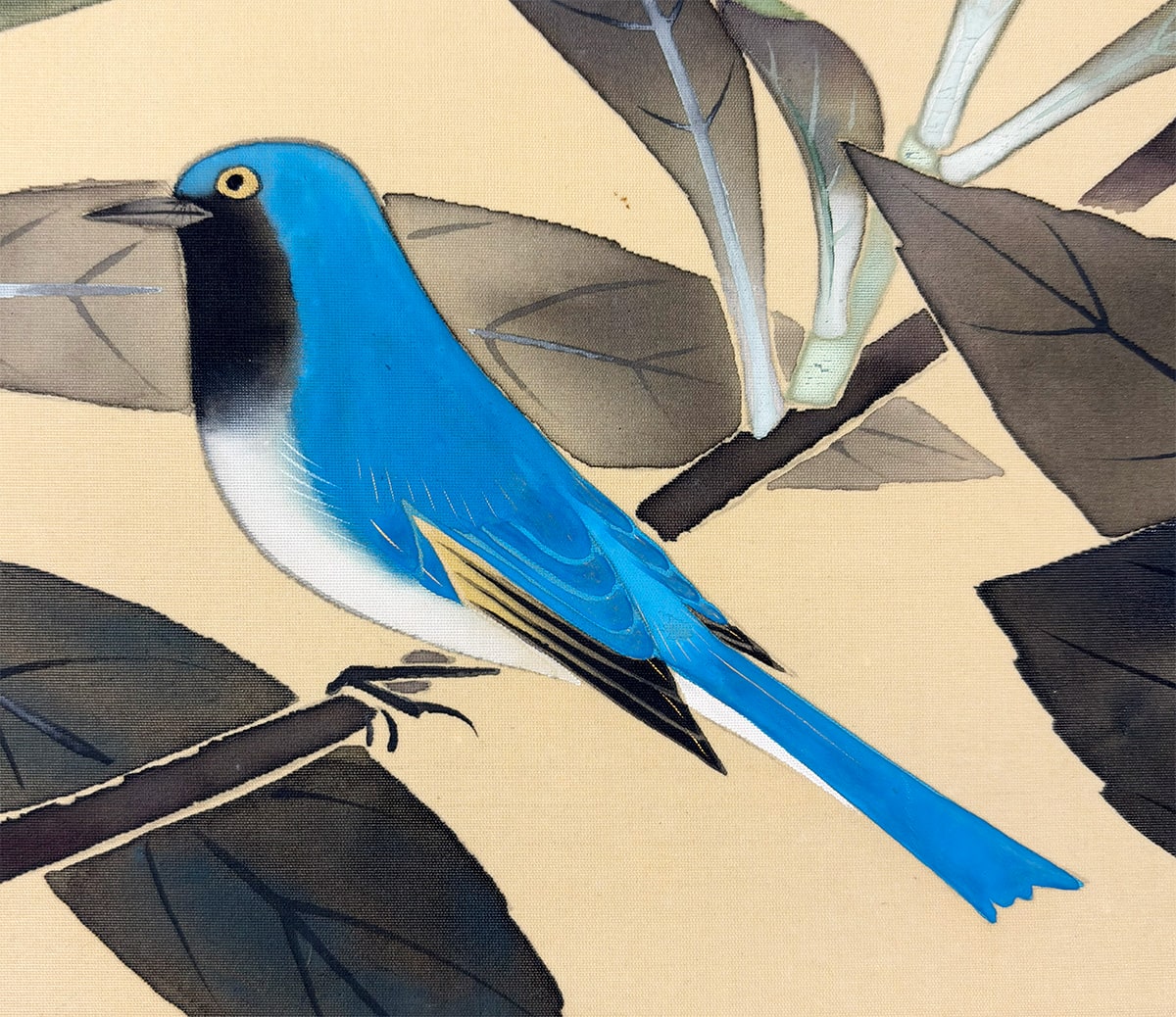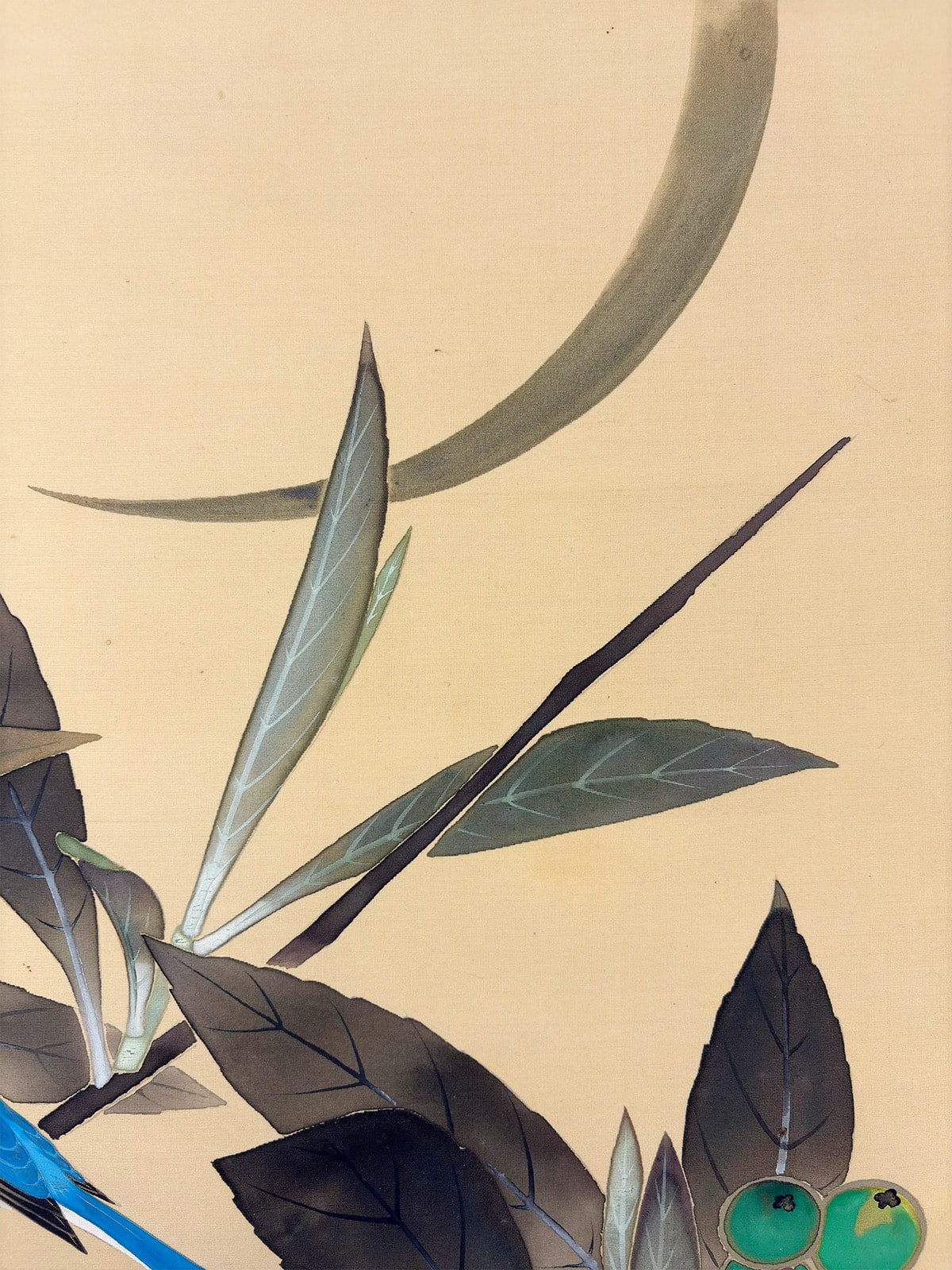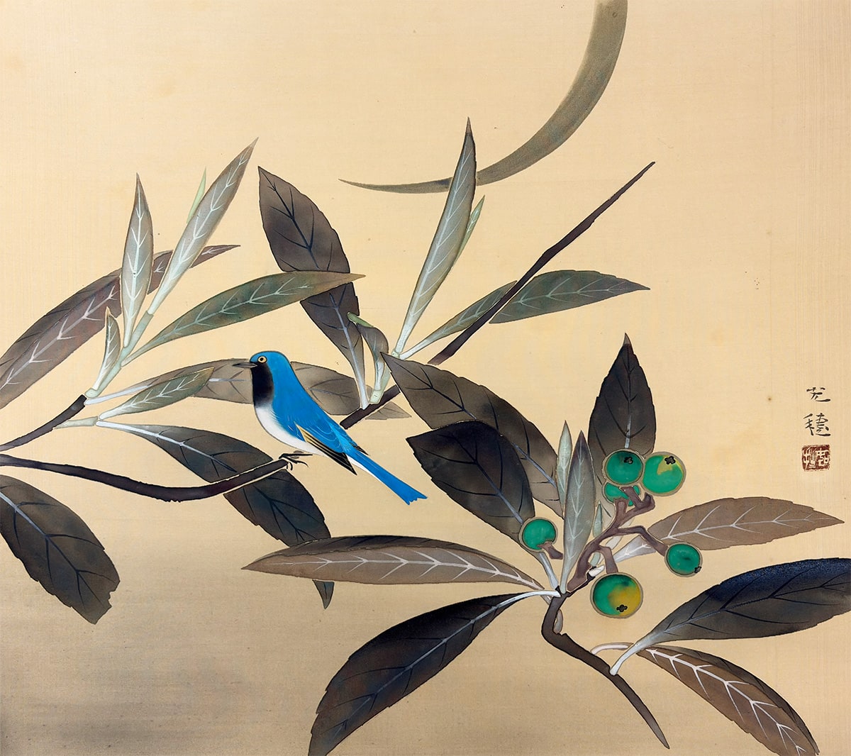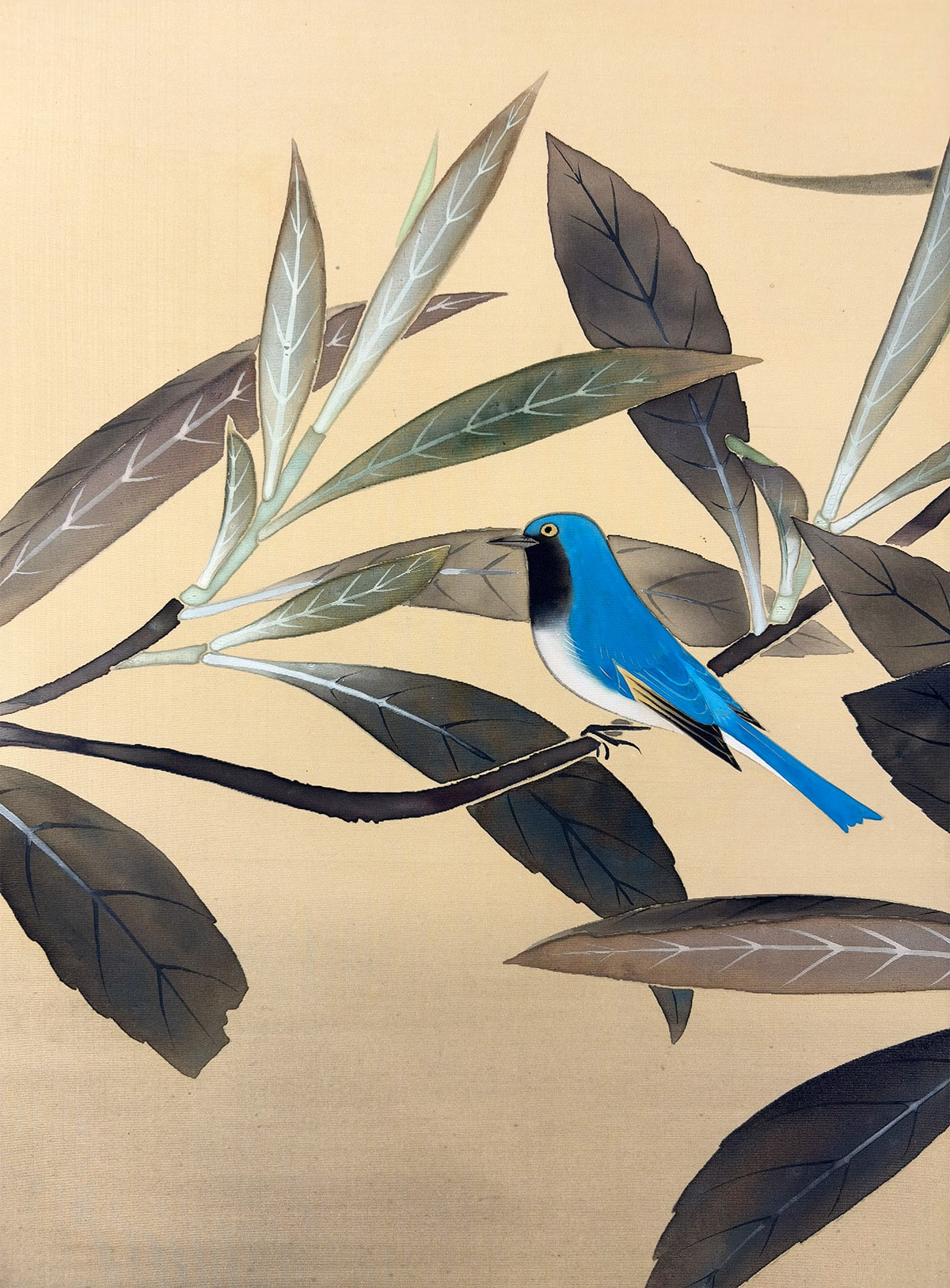●淡い空気感の中に、ルリ鳥がそっと枝にとまる静かな情景を描いた一幅です。