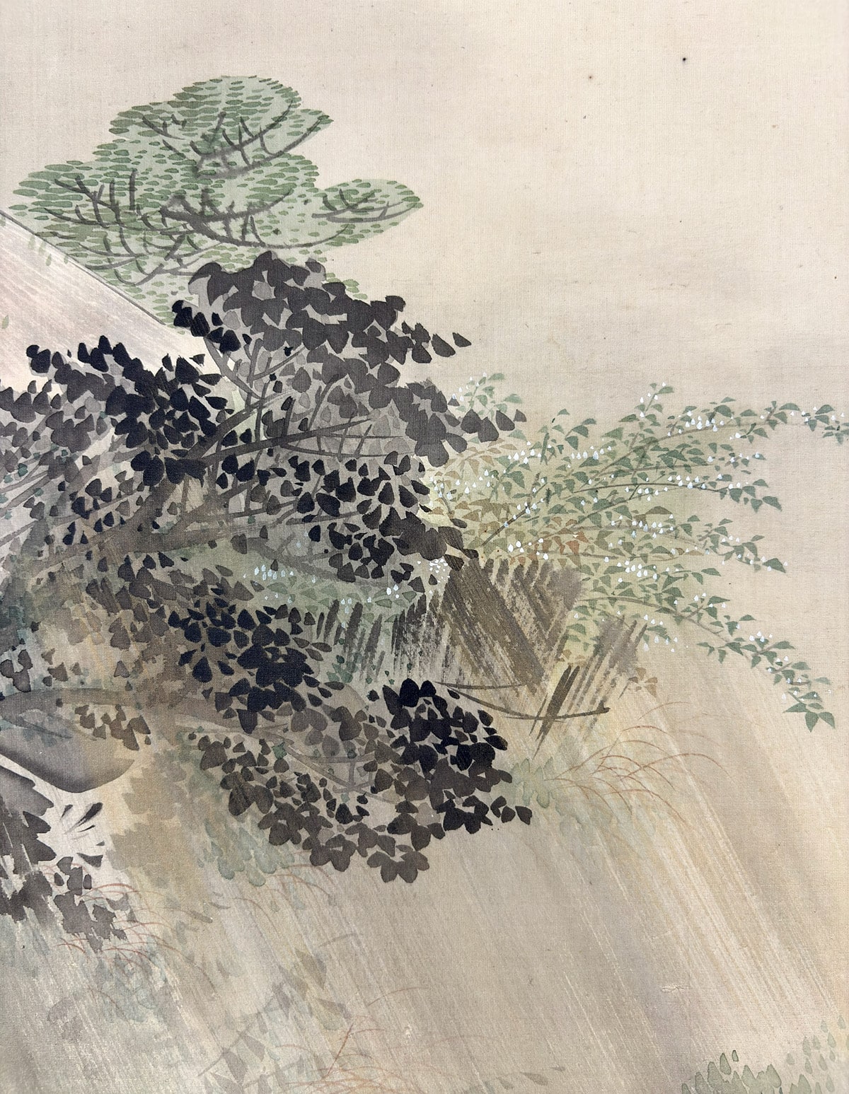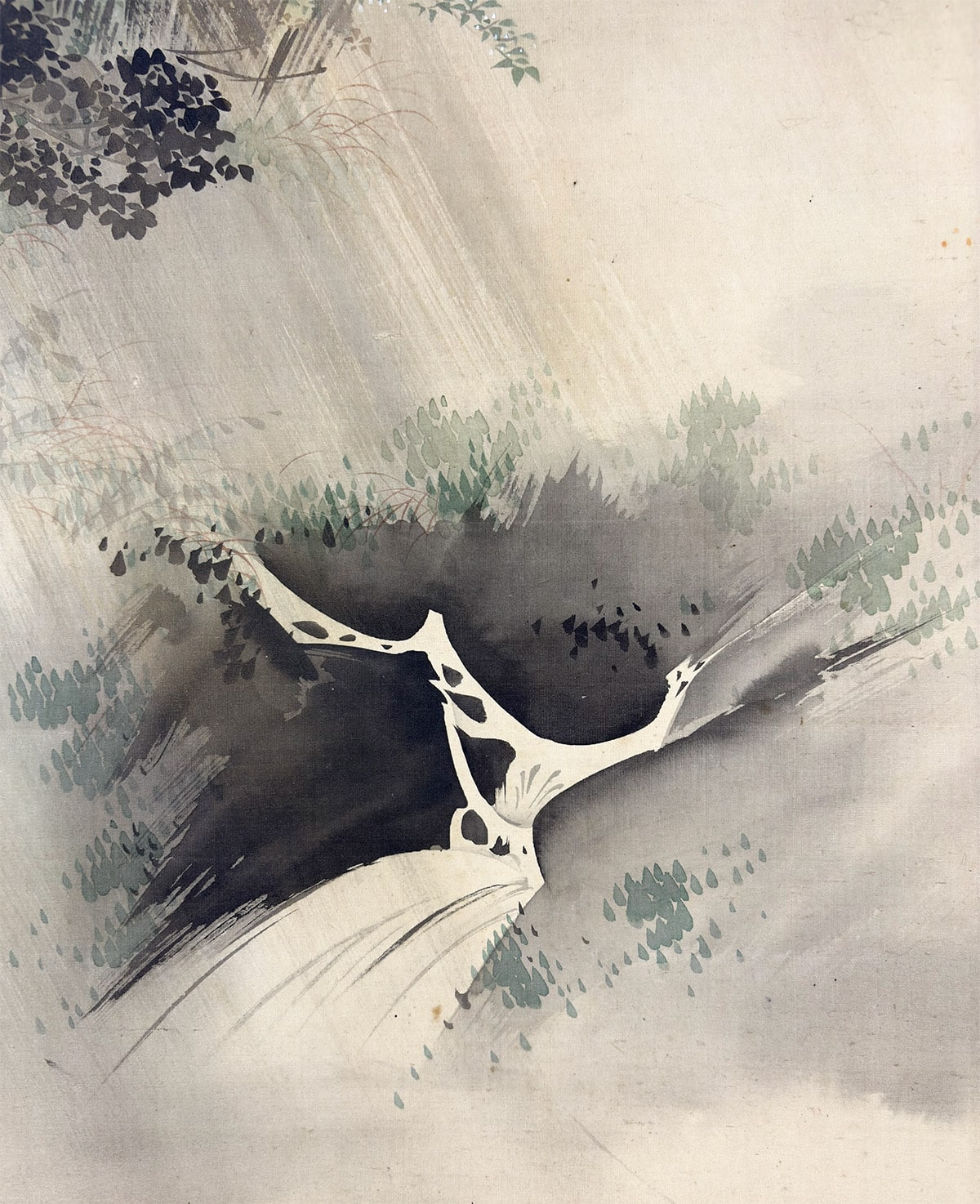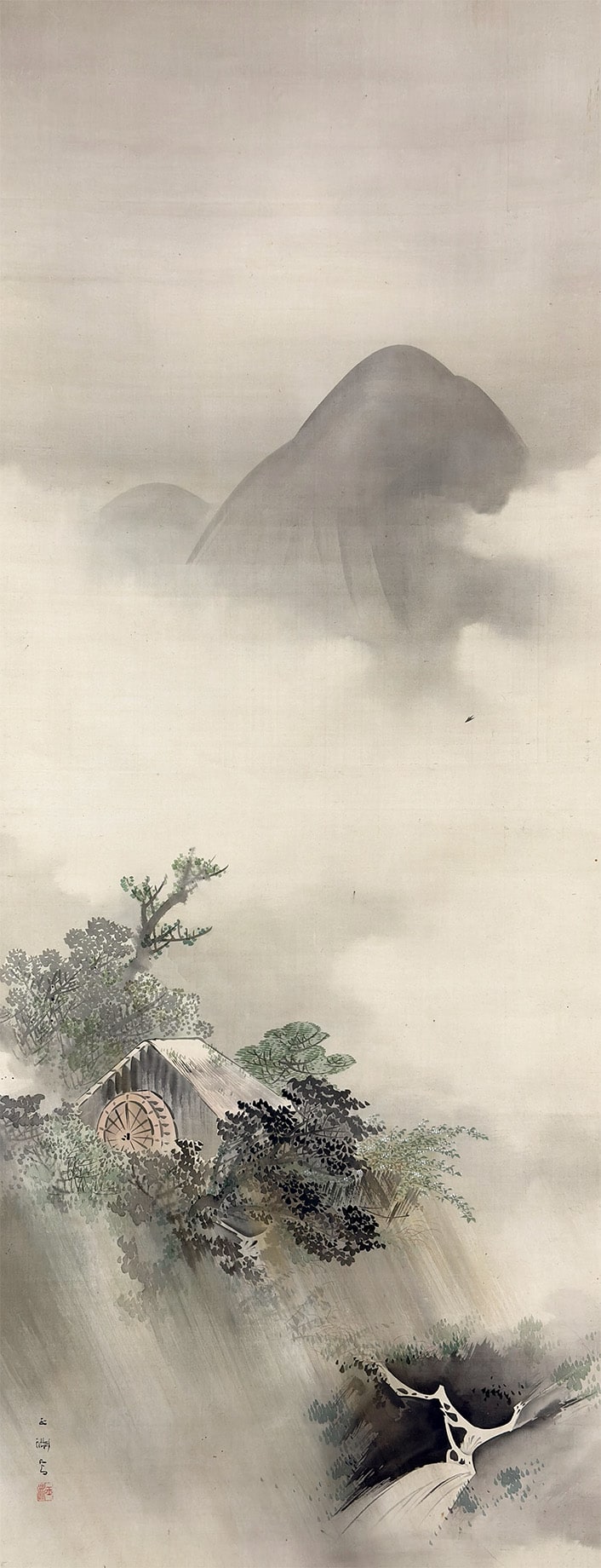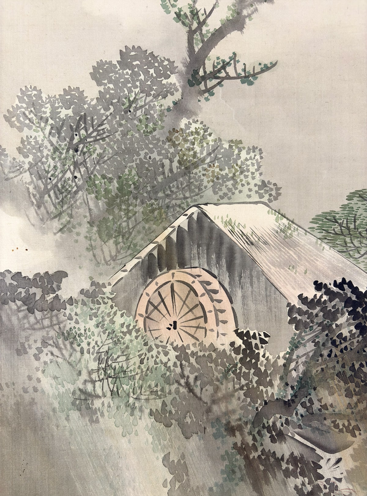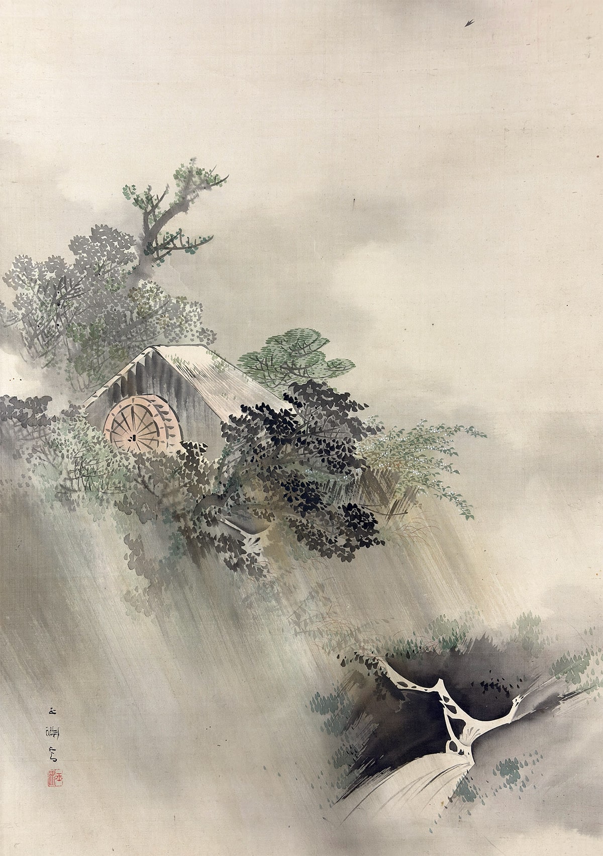 ●雨に包まれた水車小屋を静かに描いた、高橋玉淵先生の情緒豊かな一幅です。